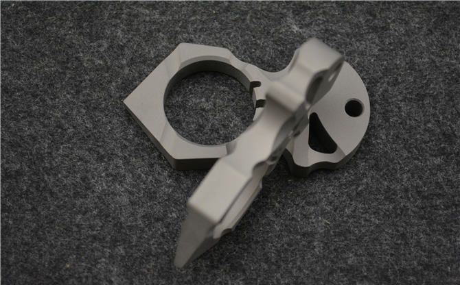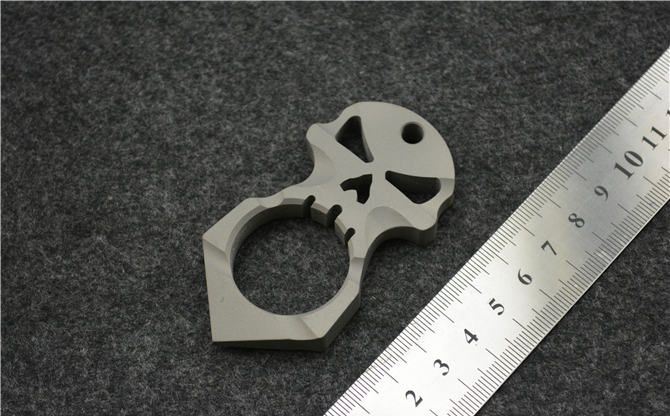 长:75mm 宽:35mm 厚:9.5mm 重量:60g 采用高强度tc4钛合金,经精光切割,然后手工打磨成型,平时是个性挂饰,在危急时可扣于中指,用于击碎车窗玻璃得以逃生。6铝4钒钛合金,国内标号tc4,一般用于战机引擎骨架乃至航天飞机的主要结构,硬度高达hrc46,尖部经过热处理硬度更高