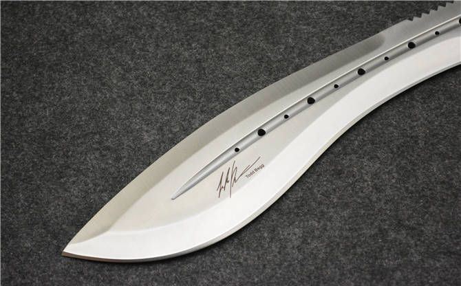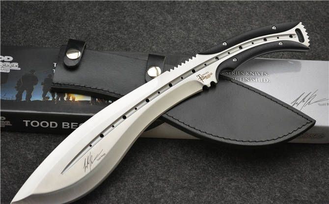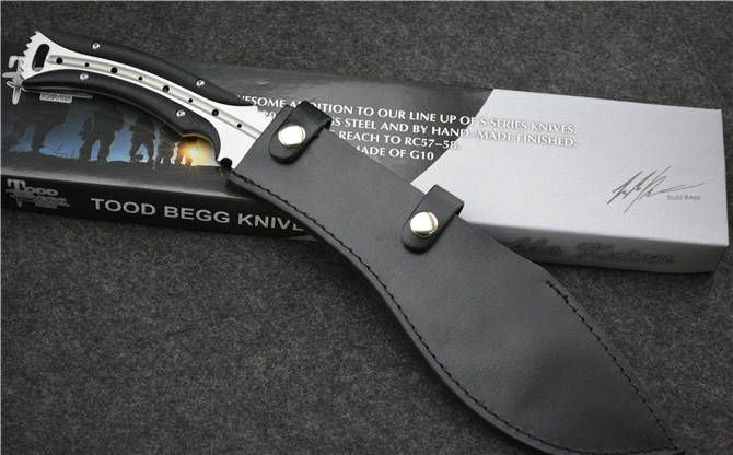 托德·贝格恶龙狗腿(大号) 全 长:390mm 刃 长:250mm 柄 长:140mm 刃最宽:65mm 刃 厚:8mm 刃 材:7cr13mov 重 量:700g(含包装) 硬 度:58HRC 表 面:砂光 柄 材:钢一体柄+G10条 锁 型:定锁 其 他:配牛皮套+牛皮纸盒子
