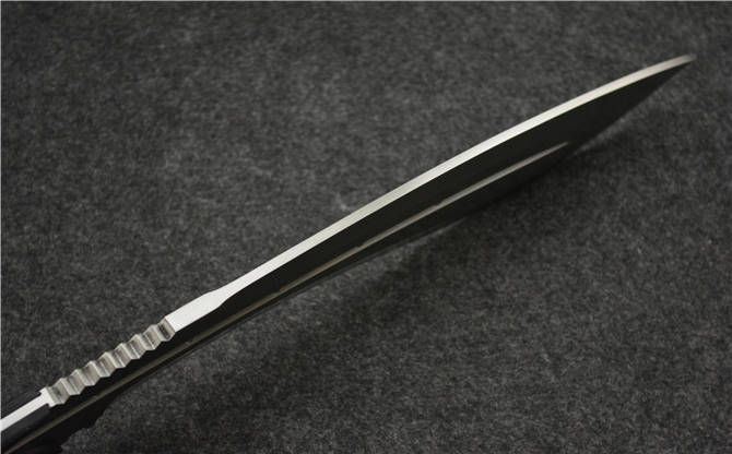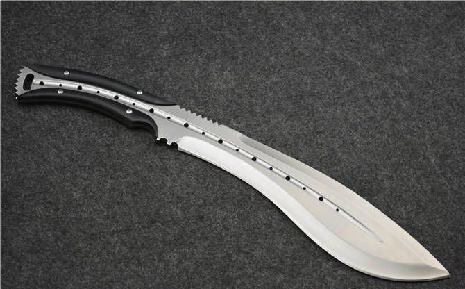 全 长:390mm 刃 长:250mm 柄 长:140mm 刃最宽:65mm 刃 厚:8mm 刃 材:7cr13mov 重 量:700g(含包装) 硬 度:58HRC 表 面:砂光 柄 材:钢一体柄+G10条 锁 型:定锁 其 他:配牛皮套+牛皮纸盒子
