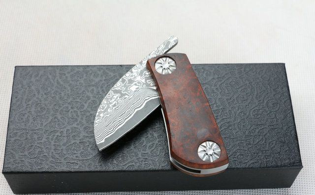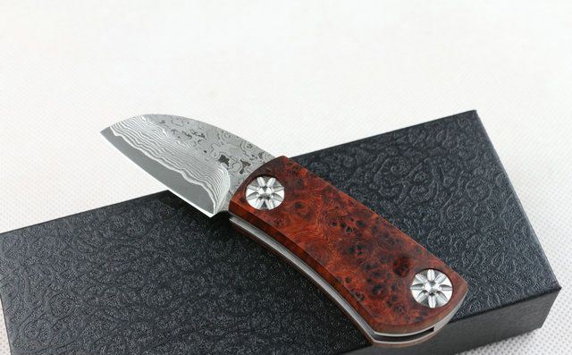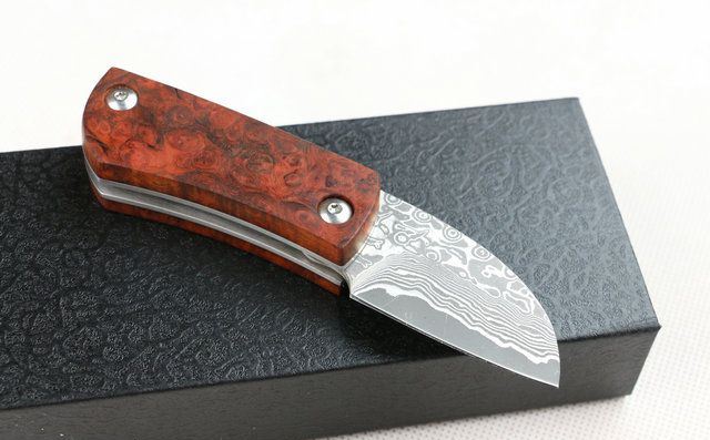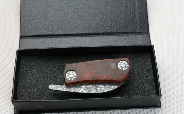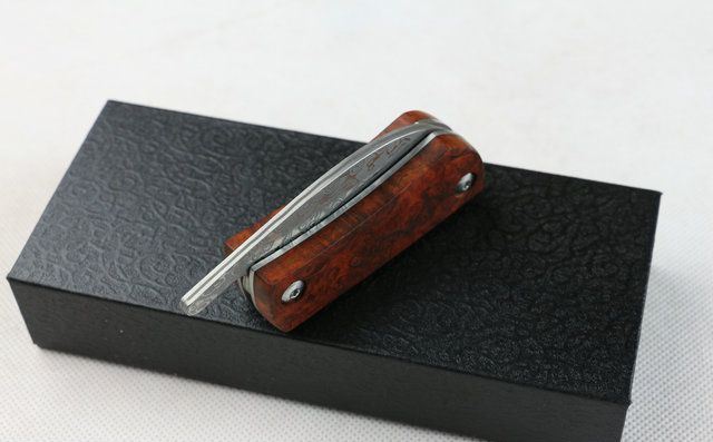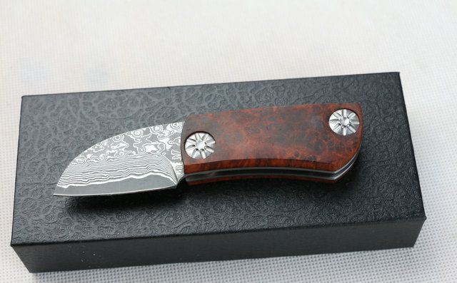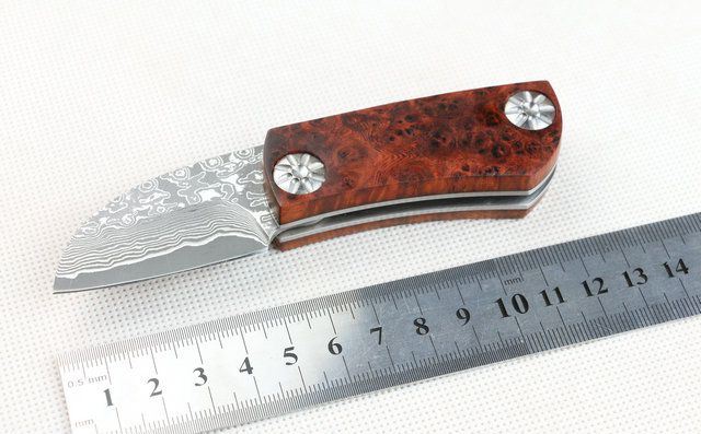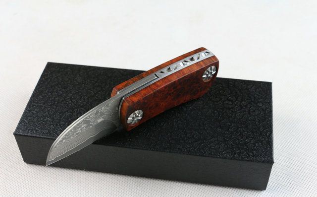 全 长:127mm 刃 长:46mm 柄 长:71mm 刃 宽:27mm 刃 厚:3mm 刃 材:大马士革钢 重 量:150g (含包装) 硬 度:57-60HRC 表 面:原有大马士革纹 柄 材:天然加厚红影木手柄,木纹纹路清楚. 锁 型:线锁。 其 它;礼品盒包装 本大马士革无锁折刀刀柄采用稀缺天然红影木,底骨人工雕花,搭配合适,非常漂亮,加上做工难度高,木材稀少,刀匠只产了少量,卖完不再生产,欲购从速。 每把刀由于大马士革钢和红影木柄纹路不同,购买以实物为准!