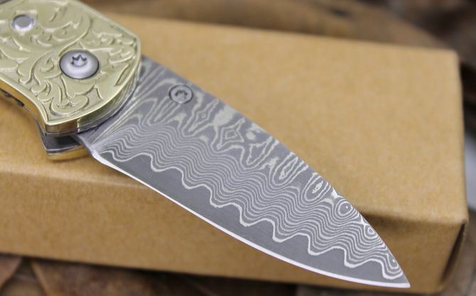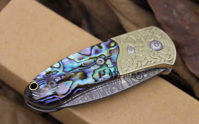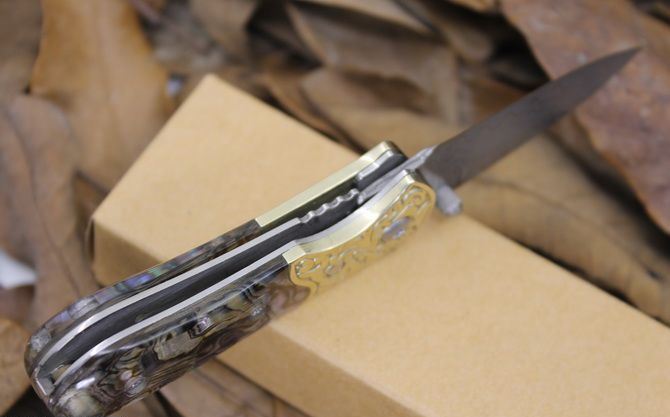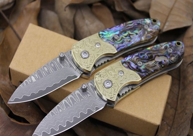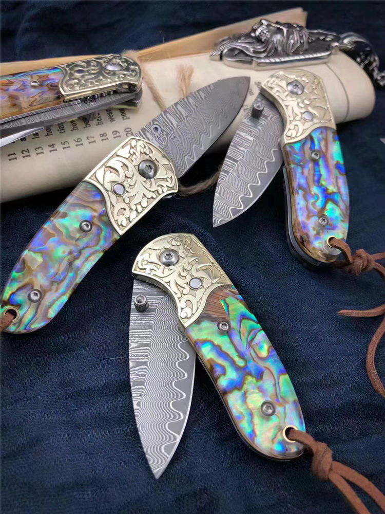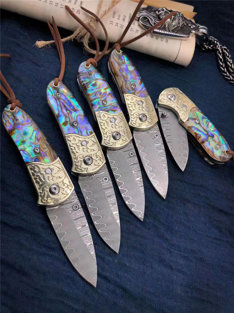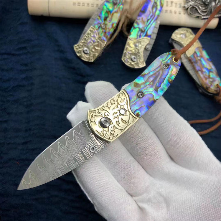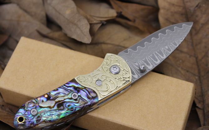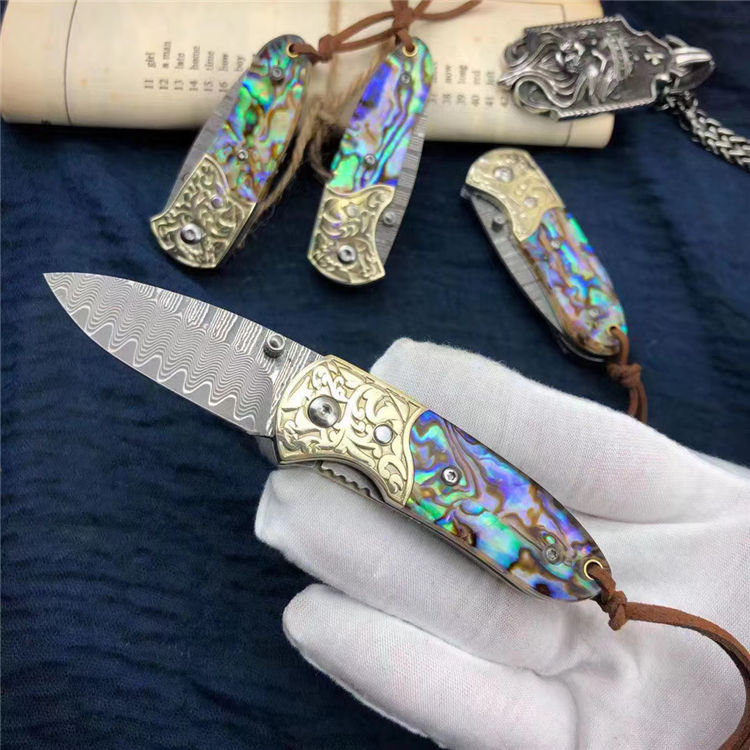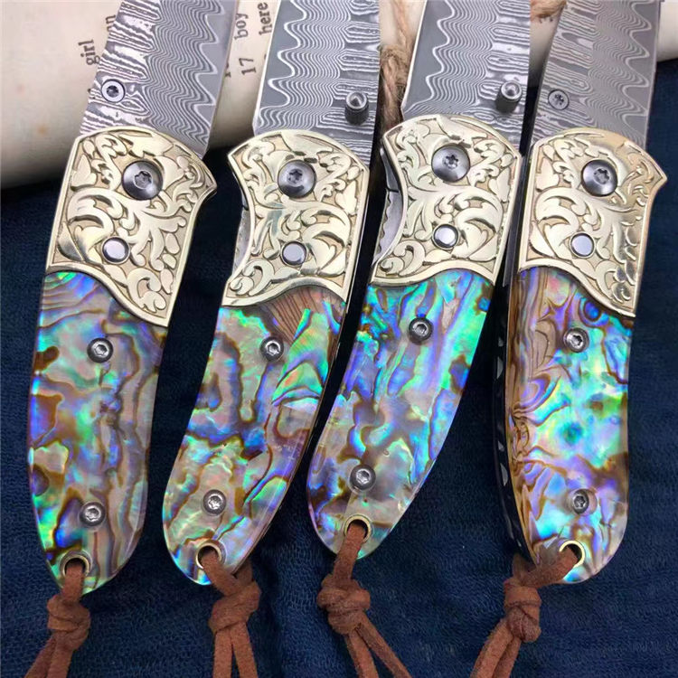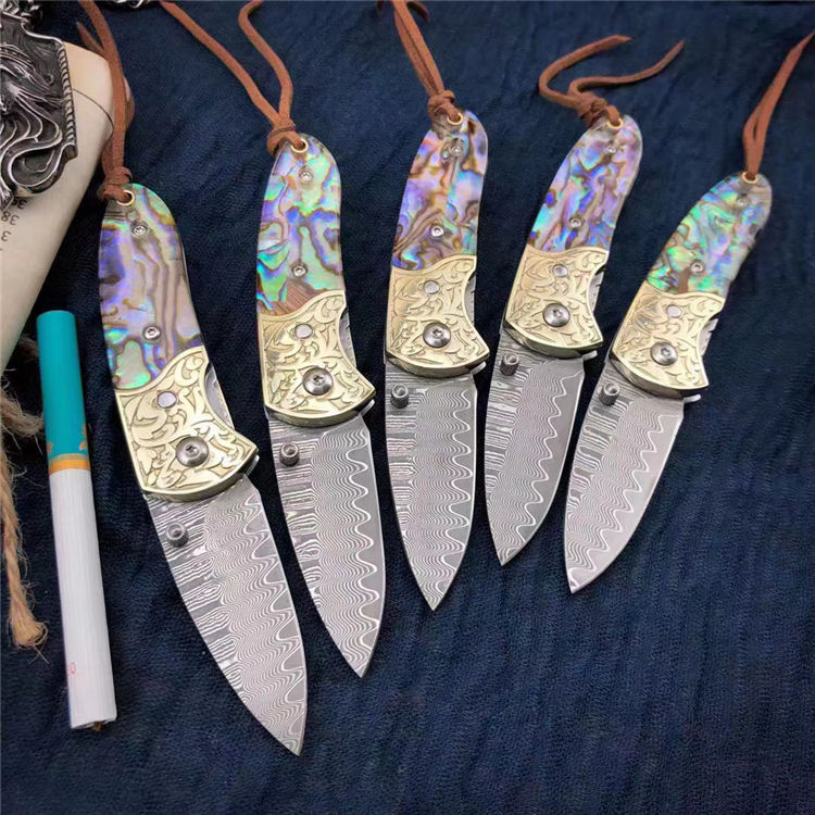 大马士革小鲍鱼 全 长: 13cm 刃 长: 5.2cm 柄 长: 7.1cm 硬 度: 59-60HRC 刃 厚: 0.2cm 刀 宽: 1.9cm 重 量: 80克含包装 表 面: 纯手工制造 柄 材: 鲍贝+铜头 刃 材: 大马士革钢 刀刃纹路各异,以实物为准 其 他: 纸盒