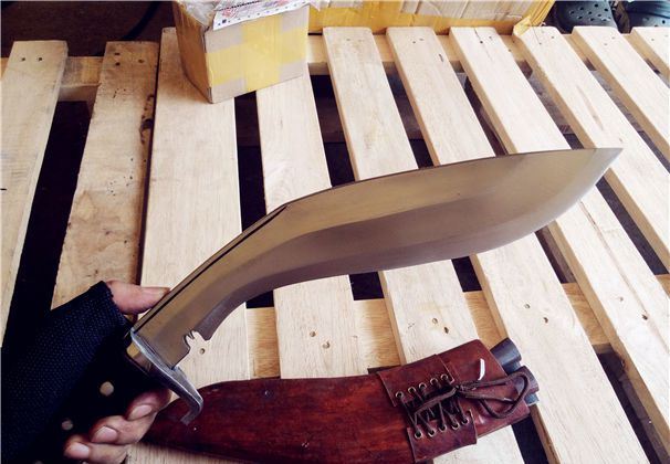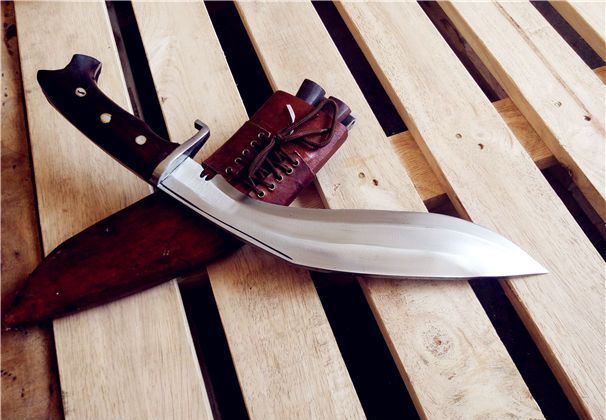 诺比特尼泊尔刀 长度:44厘米左右 厚度:1厘米左右 宽度:5.8厘米左右 硬度:52-55左右 刃材:弹簧钢 柄材:尼泊尔小叶紫檀 标配:牛皮包木刀鞘一个 辅刀两个(一开刃一不开刃) 刀面处理:简单沙面抛光(亚光雾面效果)