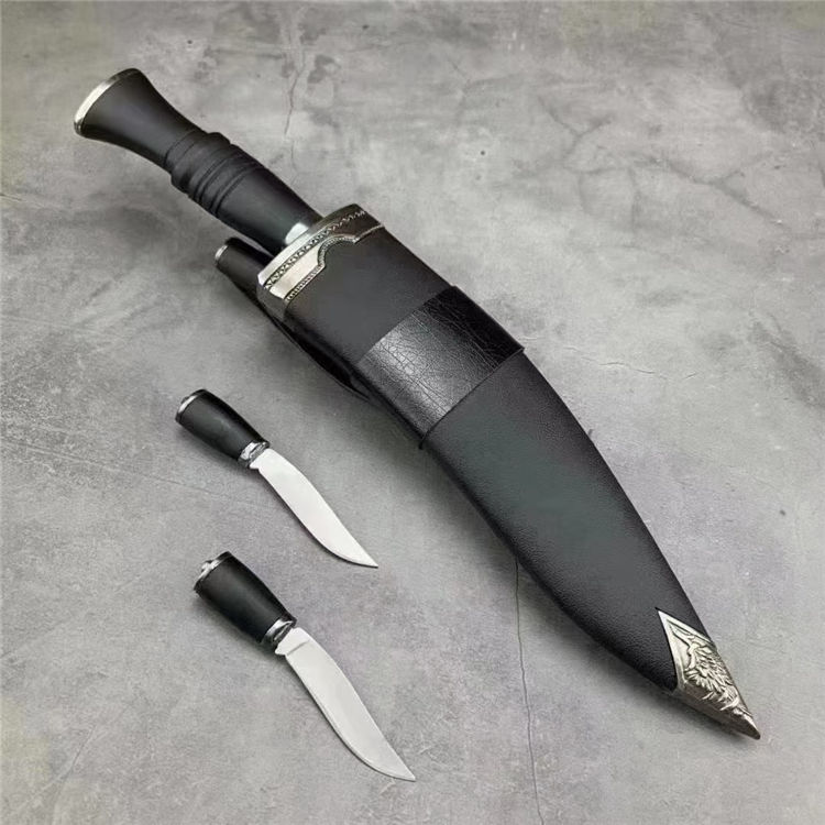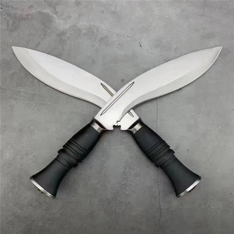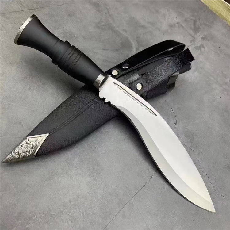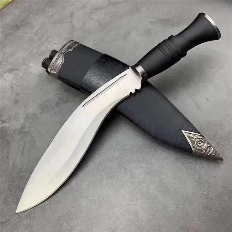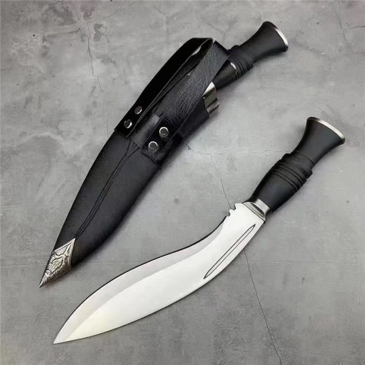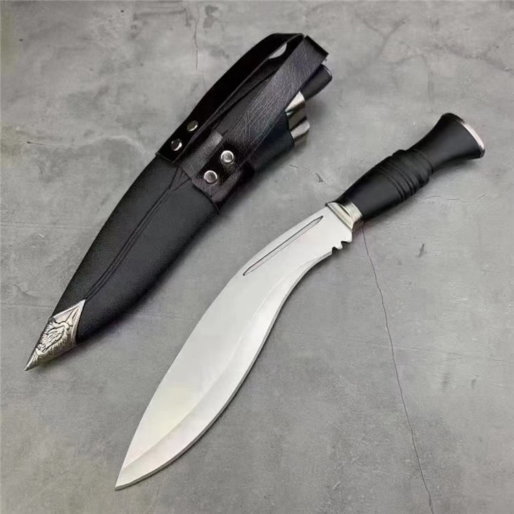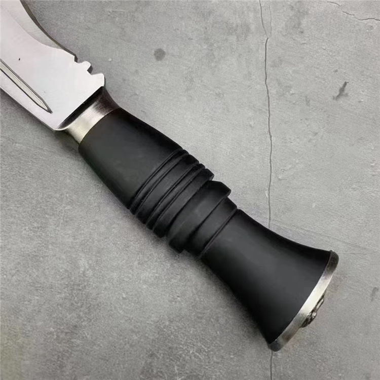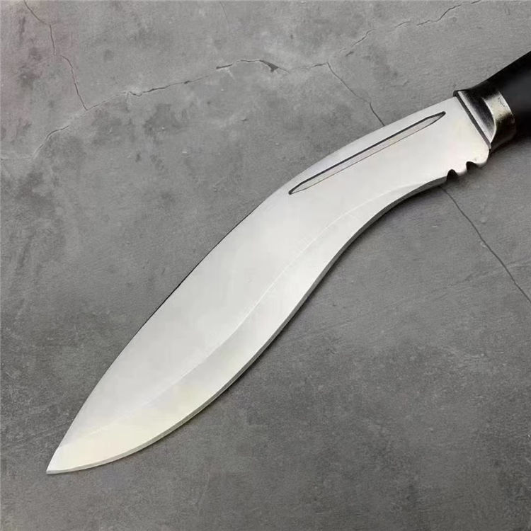 库克锐弯刀 钢材:440不锈钢 全长:30cm 刀刃:19cm 刃厚:0.4cm 柄长:10.5cm 柄材:塑料+不锈钢 毛重:700克(含皮套) 表面处理:砂光 带有两个小副刀,可以用来当作餐刀