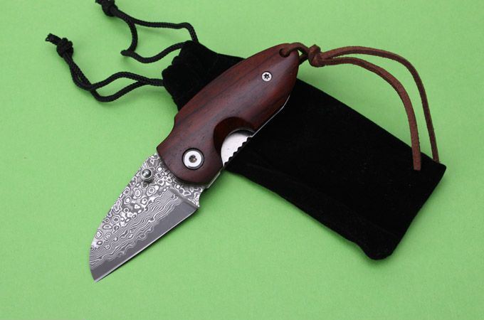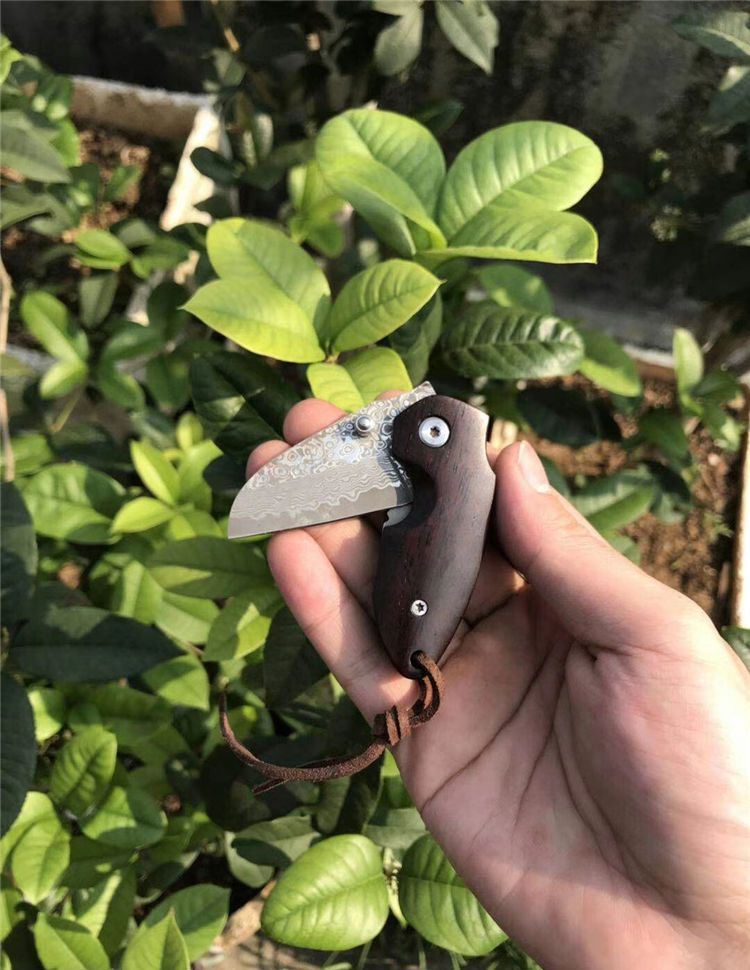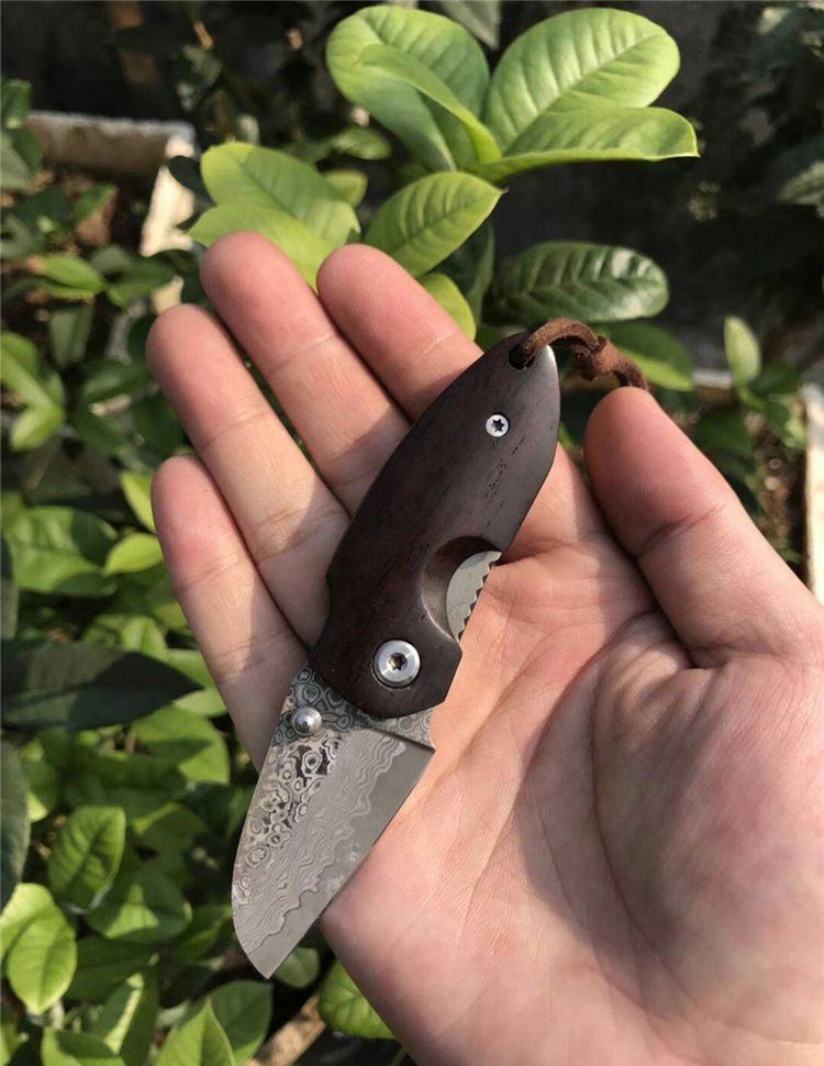 大马士革小犀牛折刀 全 长: 11.5cm 刃 长: 4.5cm 柄 长:7cm 硬 度: 59-60HRC 刃 厚: 0.3cm 重 量: 80克 表 面: 纯手工制造 柄 材: 微粒黄檀 刃 材:大马士革钢 刀刃纹路各异,以实物为准