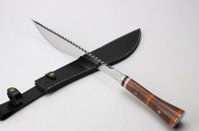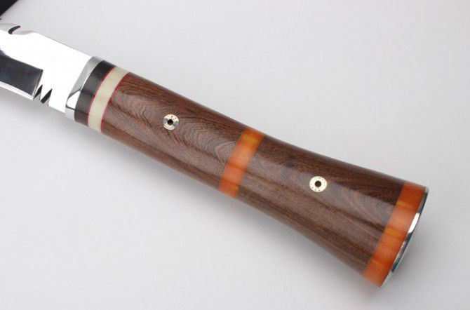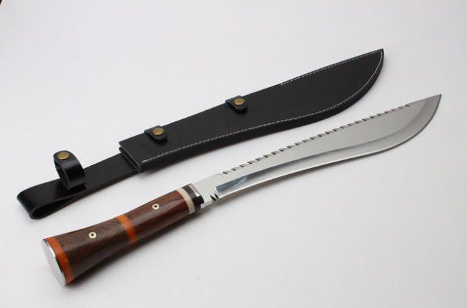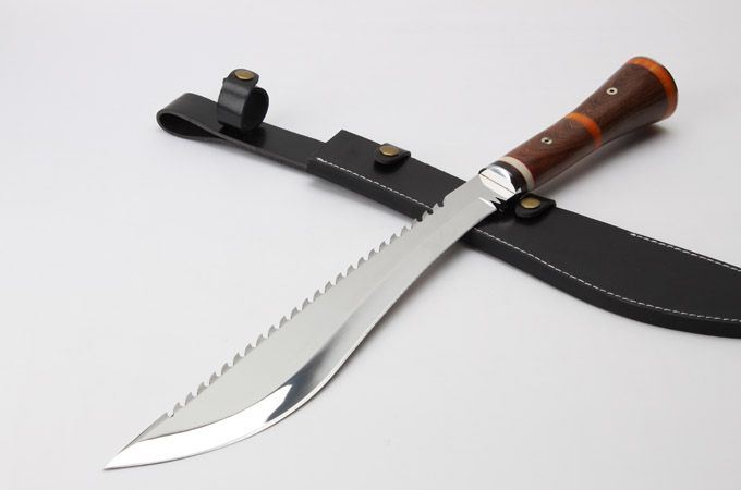 明捕大狗腿 全 长: 58.6cm 刃 长: 39.5cm 柄 长: 19.1cm 刃 厚: 5.3mm 刃 宽: 6.3cm(最宽处) 刃 材: 420 硬 度: 57HRC 刀 重: 1346克(含包装) 表 面: 超镜光 柄 材: 钢+檀木 结 构: 一体龙骨 刀 鞘: 牛皮套 +纸盒