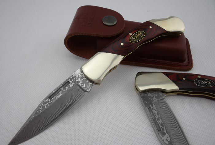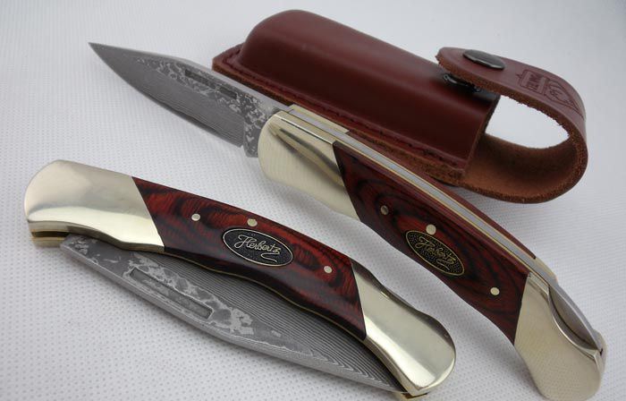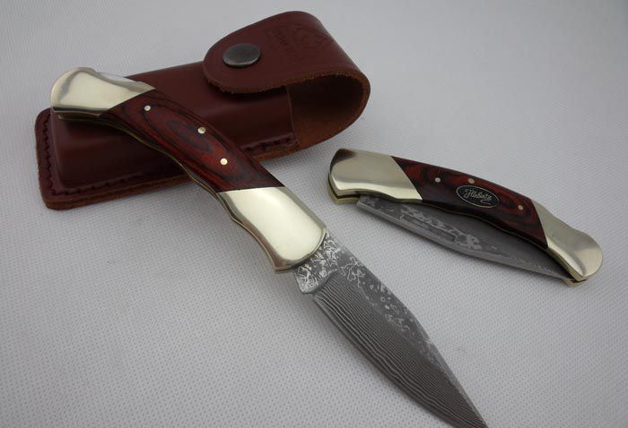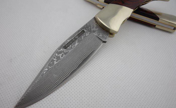 精镶黄铜名贵大马士革折刀 全 长: 19.5cm 刃 长: 7.5cm 刃 宽: 2.1cm(最宽处) 闭 合: 11.2cm 刃 材: 进口大马士革钢 硬 度: 58 表 面: 大马士革钢特有的花纹原色 刃 厚: 0.27cm 柄 材: 彩木+纯黄铜铜头 重 量: 165克 锁 闭: 传统式制尾锁 其 他: 牛皮套 该刀采用进口大马士革钢锻造制作,花纹图案清晰.刀把采用红酸枝名贵木材,纯黄铜铜头, 全部工序经过CNC电脑加工中心和人手结合的方式完成.
