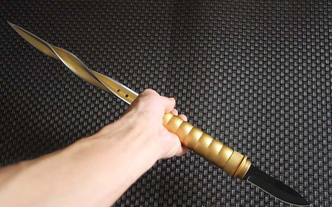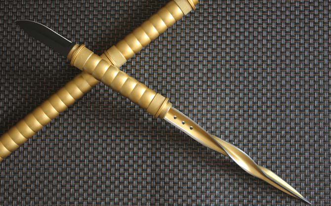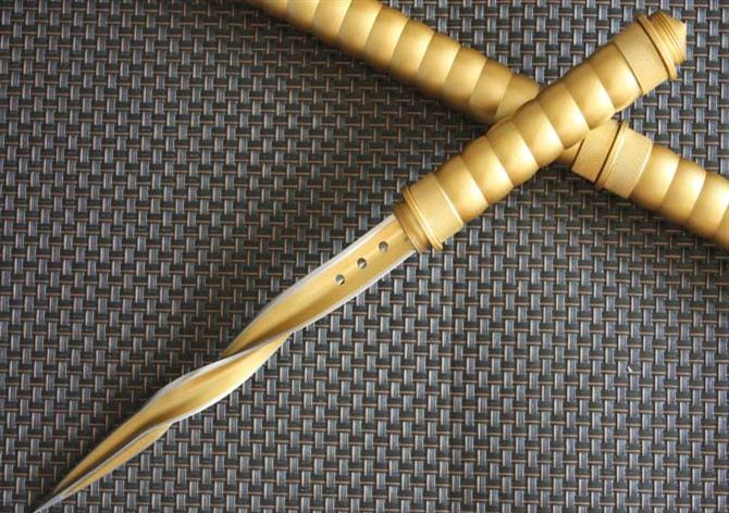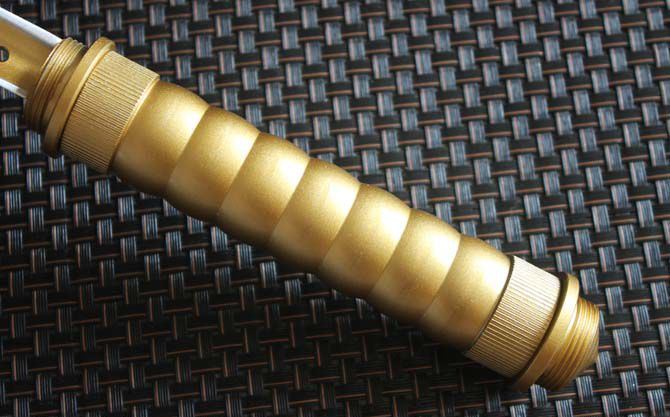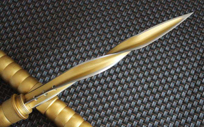 全 长:440cm 反接长度:66CM 刀刃长:10.2cm 刀刃宽:2.5cm 刃 长:235c 柄 长:172cm 刀 型:三棱刺 刃 材:7Cr17Mov 柄 材:土豪金色 刀 鞘: 尼龙鞘+彩盒 毛 重:750g