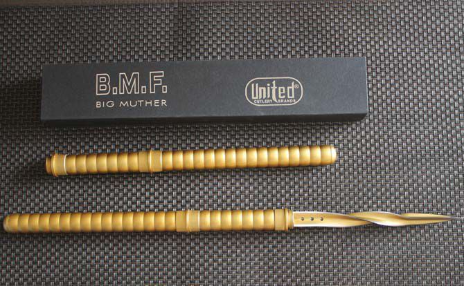 土豪金狼牙超级多功能三棱 全 长:440cm 反接长度:66CM 刀刃长:10.2cm 刀刃宽:2.5cm 刃 长:235c 柄 长:172cm 刀 型:三棱刺 刃 材:7Cr17Mov 柄 材:土豪金色 刀 鞘: 尼龙鞘+彩盒 毛 重:750g