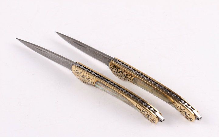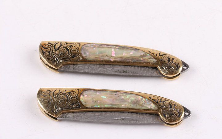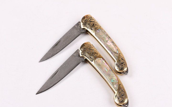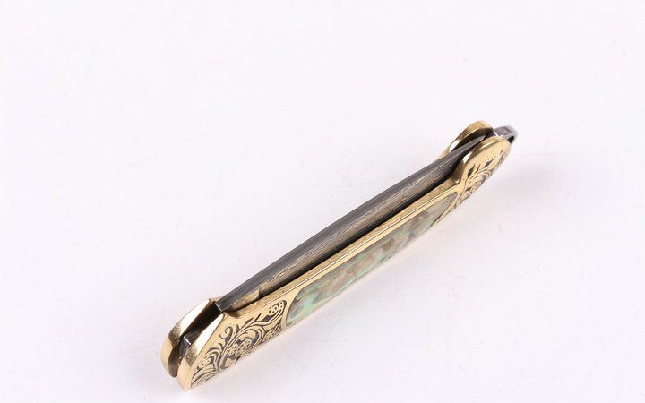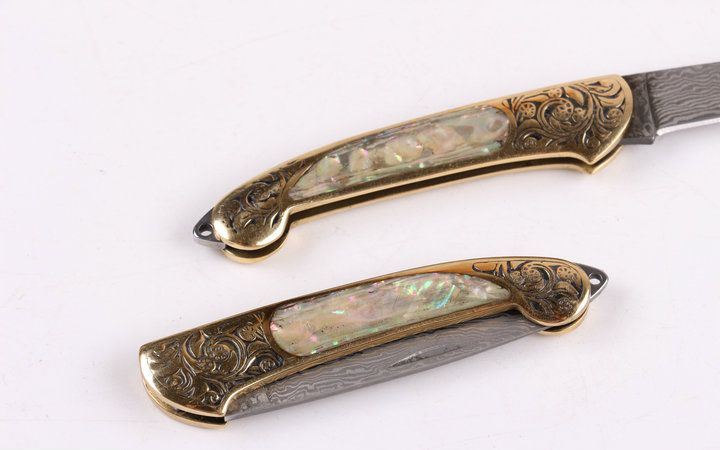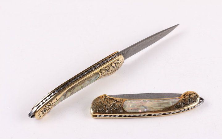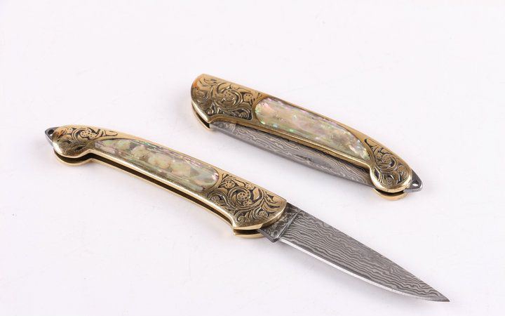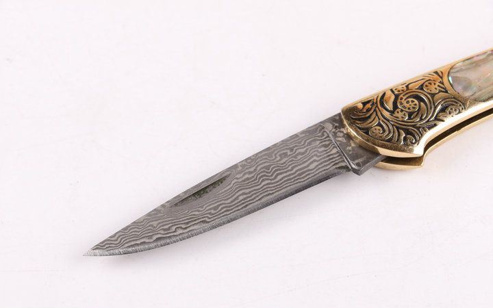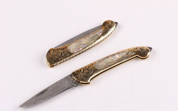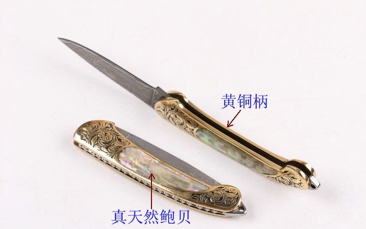 美艳女王大马小折刀 全长:14.2CM 刃长:5.3CM 刃厚: 0.23CM 刃宽:1.2CM (最宽处) 柄长: 8.2CM 刃材:大马士革钢 硬度: 59 涂层:大马士革原色图纹 柄材: 刻花黄铜+天然彩贝 重量:50克 锁定: 无 其他: 带钥匙圈