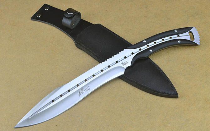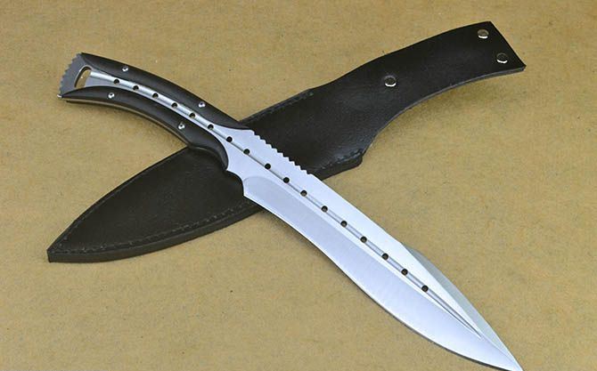 托德征服者战术直刀(加长版) 全 长:36cm 刃 长:20.8cm 刃 宽:4.3cm(最宽处) 刃 厚:5.7mm 柄 长:13cm 表 面:拉丝面 刃 材: 5Cr15 硬 度: 57HRC 柄 材: G10防滑柄片 结 构:龙骨一体贯穿整体 重 量:500克(含包装) 包 装:皮套+纸盒