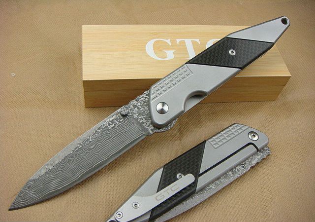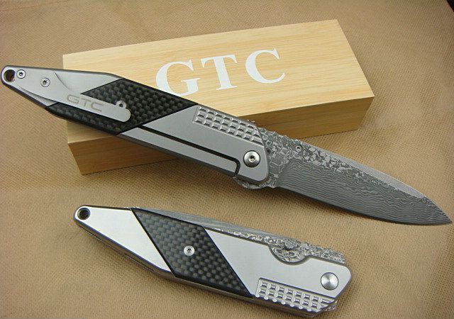 GTC飞越时空(大马士革珍藏版) 全 长: 24.2cm 刃 长: 10.5cm 刃 宽: 2.8cm(最宽处) 闭 合: 13.6cm 硬 度: 58HRC 刃 厚: 0.58cm 重 量: 310克(刀重) 表 面: 镀灰钛(档次高不容易刮花) 刃 材: 大马士革钢 柄 材: 金属加碳纤 锁 闭: 线锁 其 他: 刃口锋利,配木合