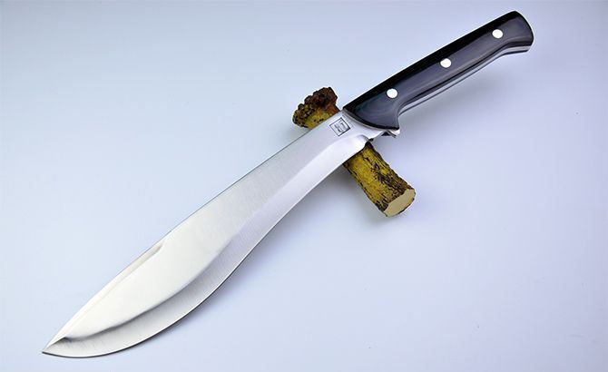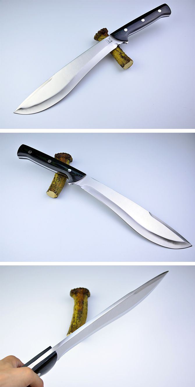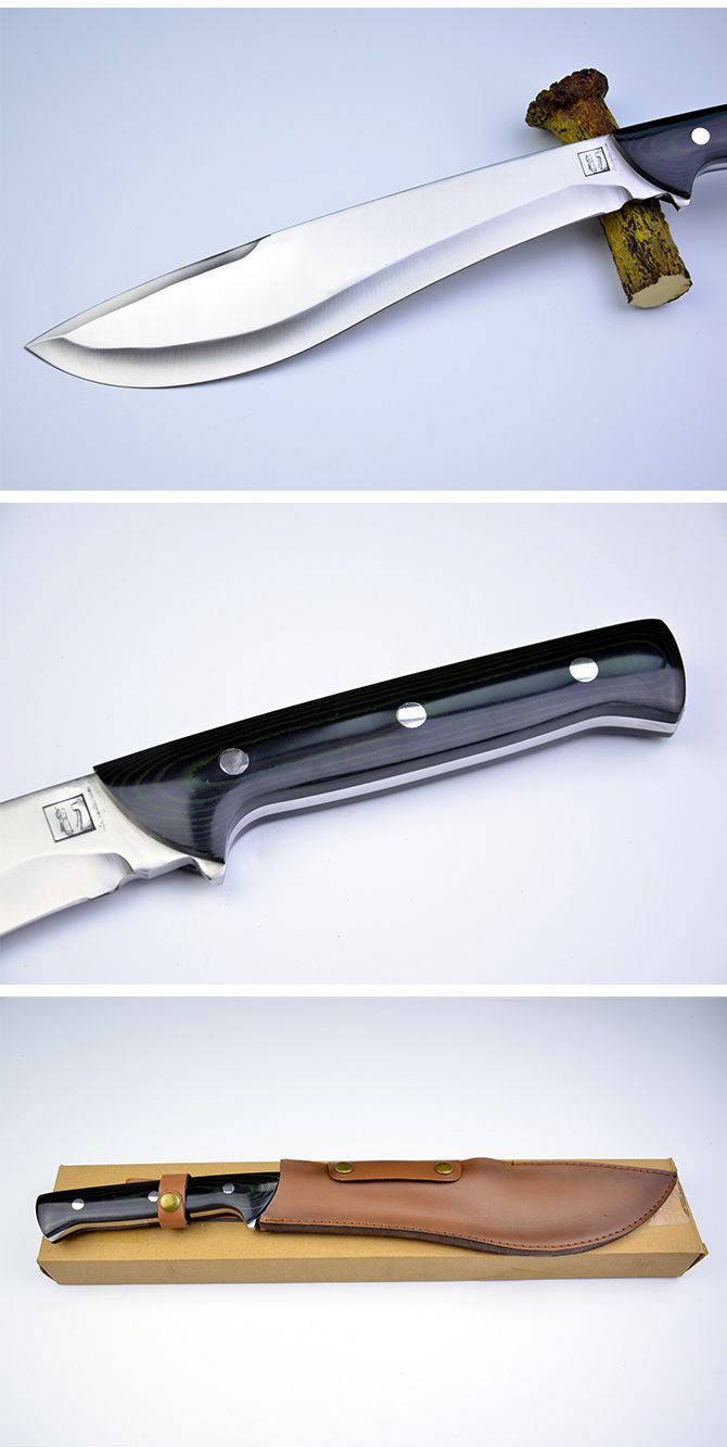 全 长: 49.8cm 刃 长: 31 刃 宽: 6.2cm(最宽处) 柄 长: 18.8cm 刃 厚: 0.6cm 刃 材: 440 硬 度: 57RHC 表 面: 丝光 柄 材: 刀身贯穿刀柄,三口坚实的钢钉铆住两面黑木 净 重: 1133克(含套) 真皮压花刀套。 品 质:高品质