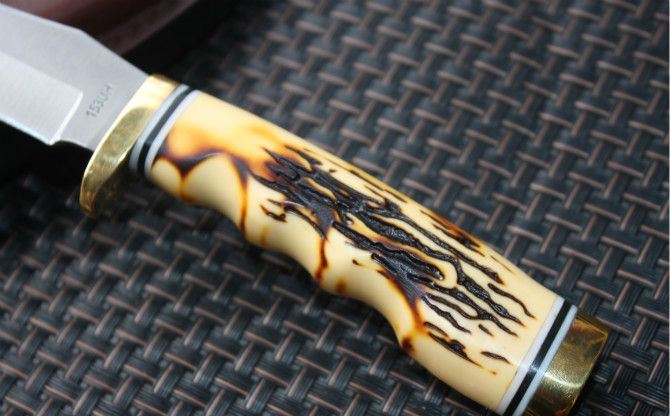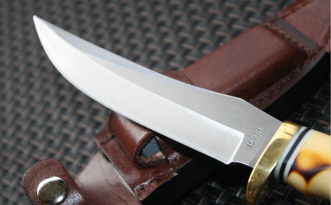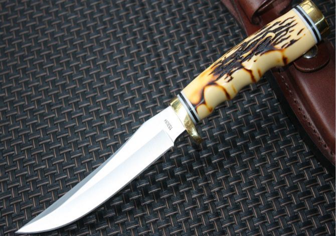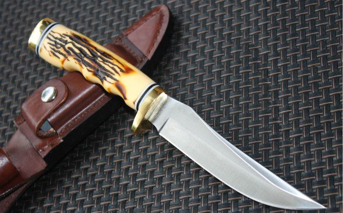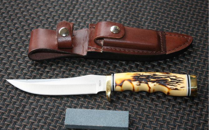 施拉德亨利叔叔经典猎刀 全 长: 23.5cm 刃 长: 12.5cm 刃 宽: 2.5cm(最宽处) 柄 长: 11cm 刃 厚: 0.32cm 刃 材: 7Cr17Mov 硬 度: 59RHC(高硬度) 净 重: 290克(含套) 表 面: 砂光 柄 材: 野兽骨柄,刀身贯穿刀柄,两头铸铜 其 他:牛皮刀套