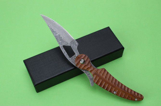大马士革MOKI羽柄肥厚守猎折刀 全 长:214mm 刃 长:93mm 柄 长:124mm 刃 宽:28mm 刃 厚:3mm 刃 材:大马士革 重 量:168g(含包装) 硬 度:58HRC 表 面:大马士革原纹 柄 材:绿檀木 锁 型:线锁 其 他:配皮套+礼品盒