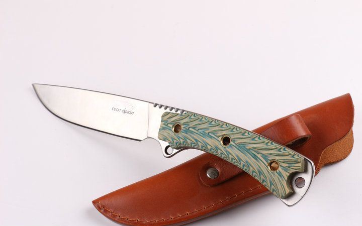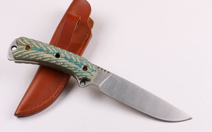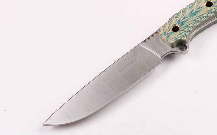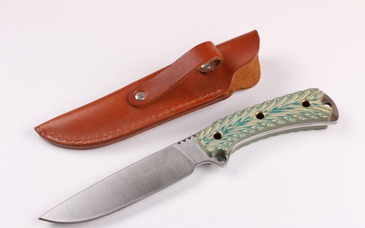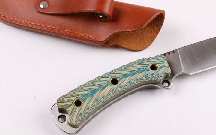 全长:23.8cm 刃长:11.2cm 柄长:11.5cm 刃厚:3.6mm 刃宽:2.9cm 刃材:7CR17MOV 柄材:龙骨结构+七彩G10 硬度:59HRC 毛重:300克(含包装物) 刀套:真皮皮套 表面处理:砂光