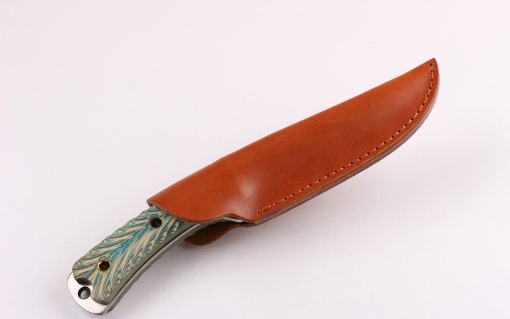 七彩凤尾直刀 全长:23.8cm 刃长:11.2cm 柄长:11.5cm 刃厚:3.6mm 刃宽:2.9cm 刃材:7CR17MOV 柄材:龙骨结构+七彩G10 硬度:59HRC 毛重:300克(含包装物) 刀套:真皮皮套 表面处理:砂光