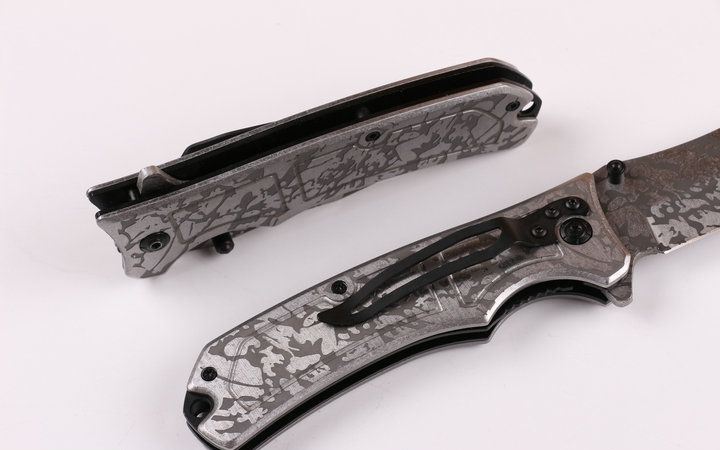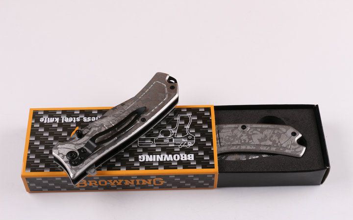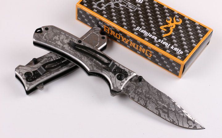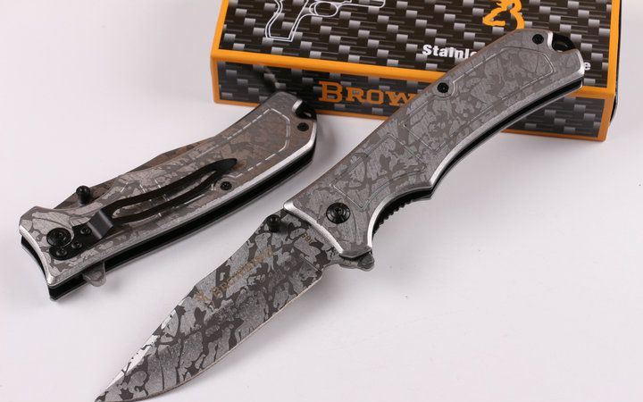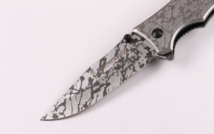 勃朗宁365快开折刀(蚀纹) 全 长:21.3cm 刃 长:8.8cm 刃 宽:2.8cm(最宽处) 刃 厚:3.3mm 柄 长:12.3cm 表 面: 全钛 刃 材: 440C 硬 度: 57HRC 柄 材: 全钢 重 量:250克(含彩盒子) 锁 闭:线锁 备 注:带腰夹