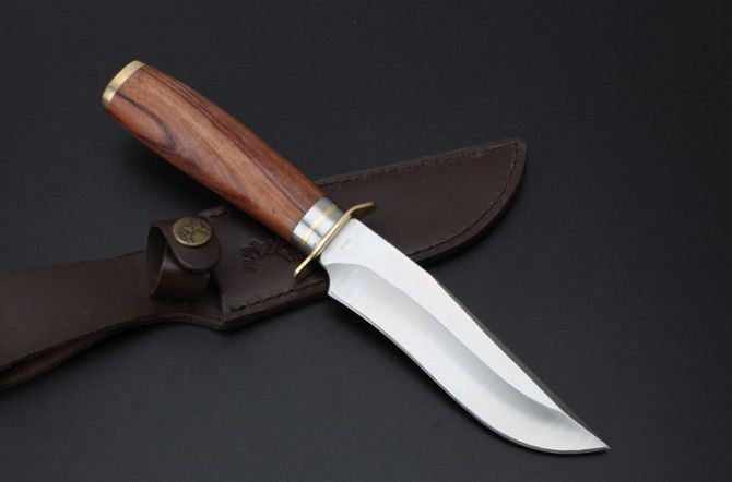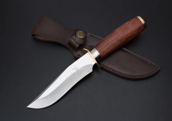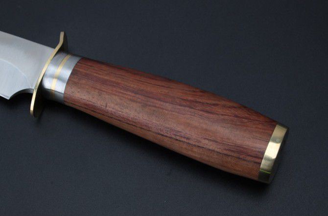 全 长:24.3cm 刃 长:13.3cm 柄 长:11cm 刃 宽:3cm 刃 厚:4.8mm 刃 材:440C 重 量:559g(含包装) 硬 度:57-58HRC(超锋利) 表 面:精幼砂光 柄 材:红斑木+精铸纯铜 其 他:高档纸盒和皮套