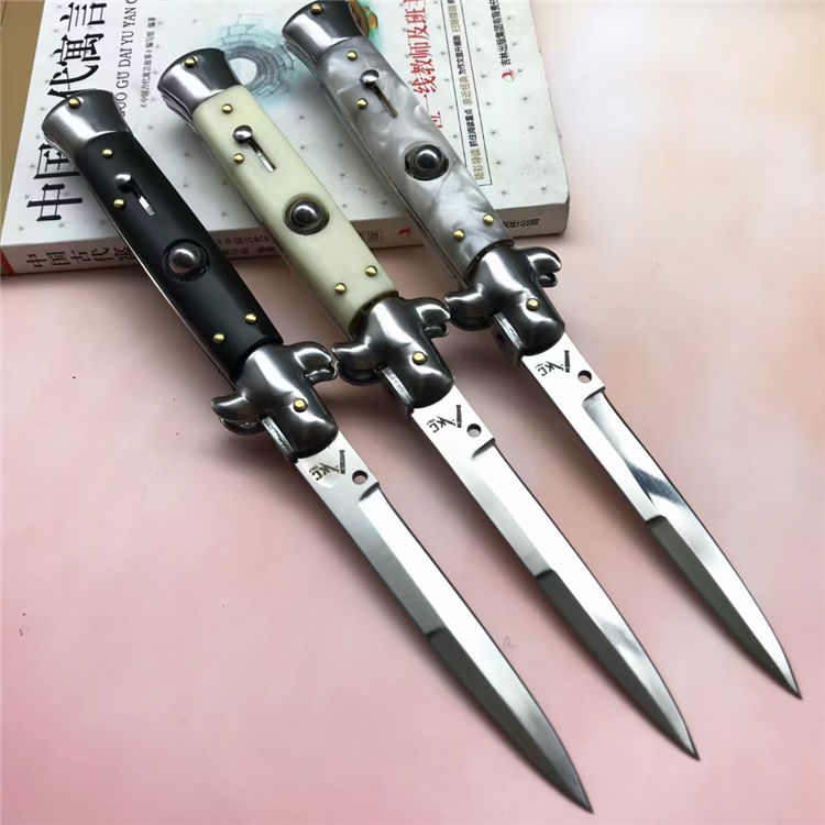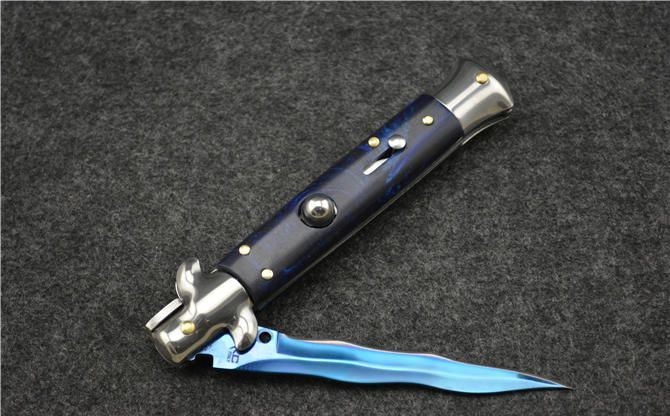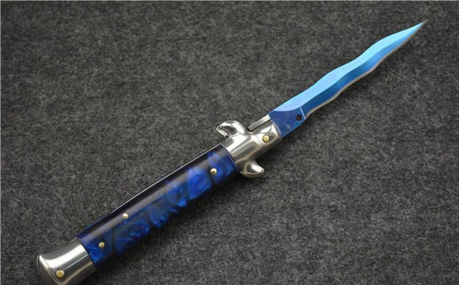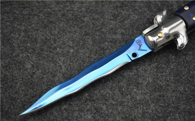 全 长:22.9CM 刃 长:10.2CM 柄 长:325MM 刃 厚:3.0mm 刃 材:440 刀 柄:亚力克梦幻蓝 开刀方式:弹簧 重 量:150克 2014新款9寸AKC意大利黑手党-赌徒跳刀,在电影"教父"里出尽了风头!水波浪刃的黑手党侧跳,仿牛角亚力克柄,弹力超强,锁定到位,440刺刀刃镜面,带有保险装置,刀护手处暗藏闭合开关,出口产品,质量保证!满足把玩和收藏需要