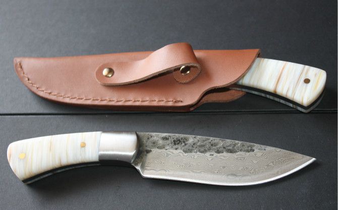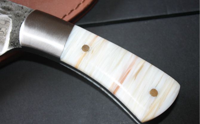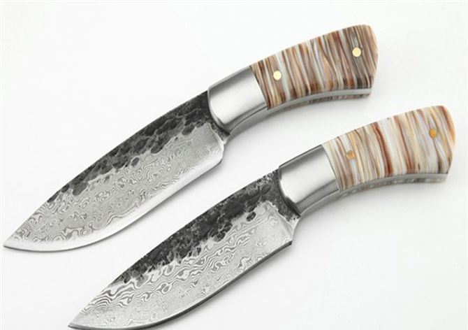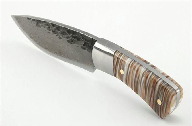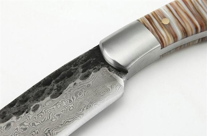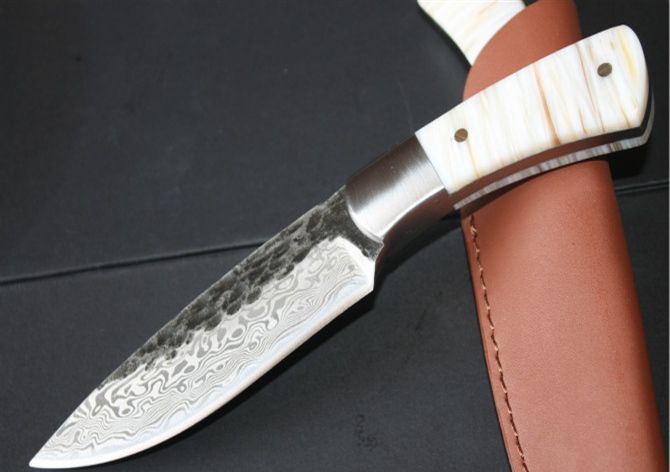 纯手工真包贝壳1002花纹猎刀 全 长: 21.5cm 刃 长: 11.5 刃 宽: 3.4cm(最宽处) 柄 长: 9.7cm 刃 厚: 0.48cm 刃 材: 锻打花纹钢 硬 度: 58RHC 表 面: 锻打花纹 工 艺:手工锻造 柄 材: 钢头+天然真包贝壳 重 量: 320克(含套) 其 他:手工水磨,一体龙骨结构,配优质牛皮刀套