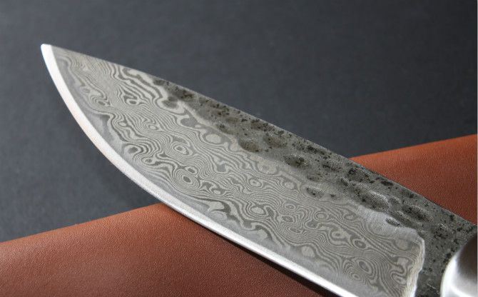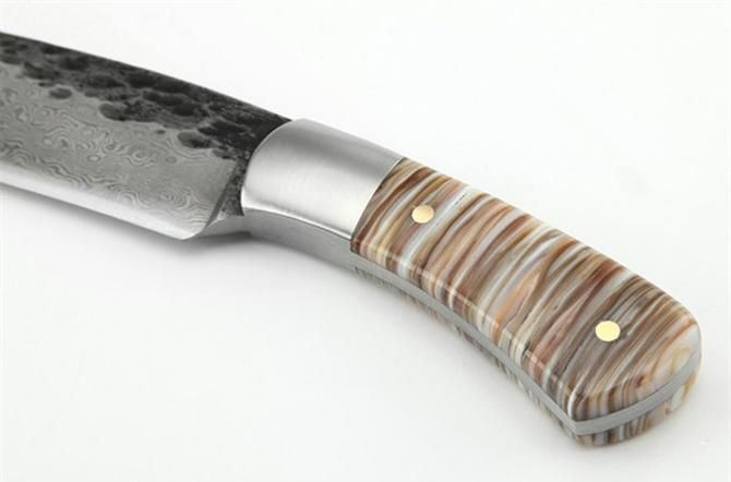 全 长: 21.5cm 刃 长: 11.5 刃 宽: 3.4cm(最宽处) 柄 长: 9.7cm 刃 厚: 0.48cm 刃 材: 锻打花纹钢 硬 度: 58RHC 表 面: 锻打花纹 工 艺:手工锻造 柄 材: 钢头+天然真包贝壳 重 量: 320克(含套) 其 他:手工水磨,一体龙骨结构,配优质牛皮刀套