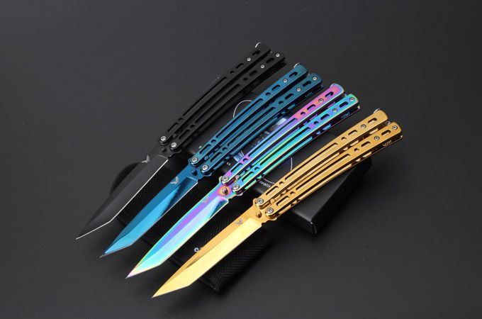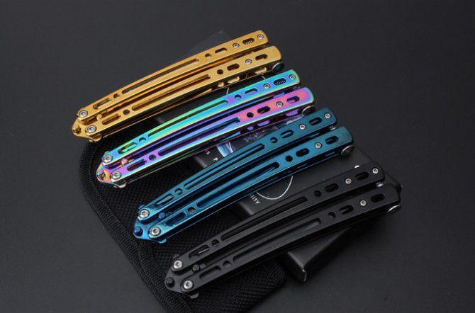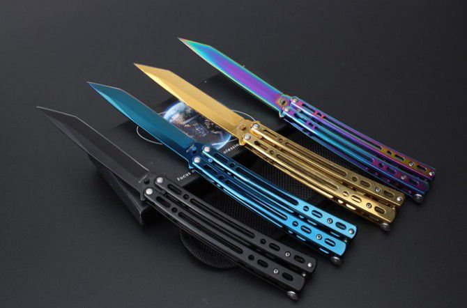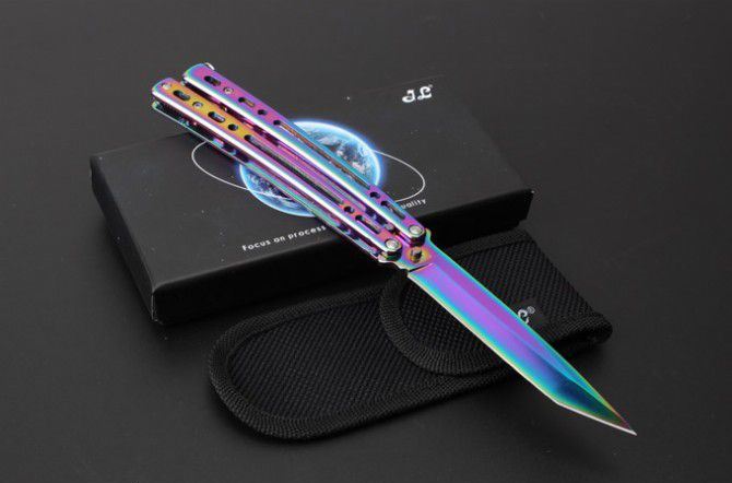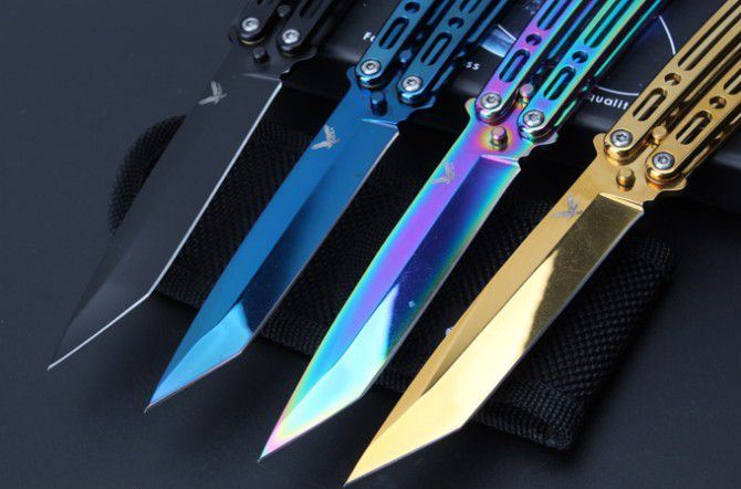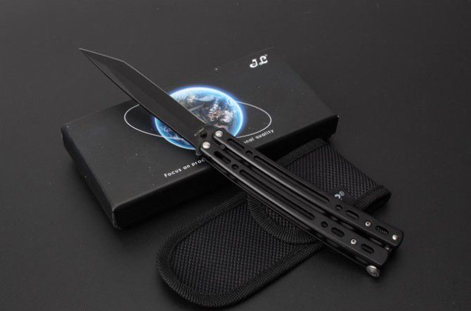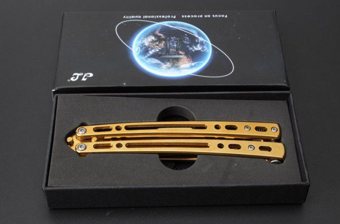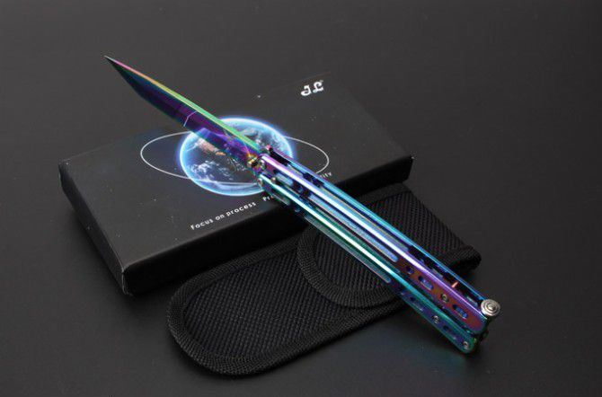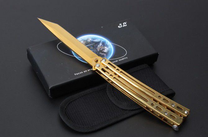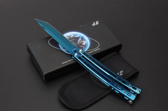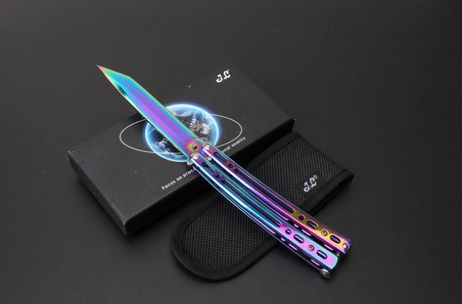 JL07穿越火线蝴蝶甩刀 全 长:235mm 刃 长:97mm 柄 长:123mm 刃 宽:19mm 刃 厚:2.6mm 刃 材:8Cr13Mo 硬 度:55HRC 表 面:黑色、蓝色、彩钛、金色(购买时候要注明产品颜色) 柄 材:钢柄 净 重:150克 重 量:192g(含包装) 其 他:配彩盒和尼龙套