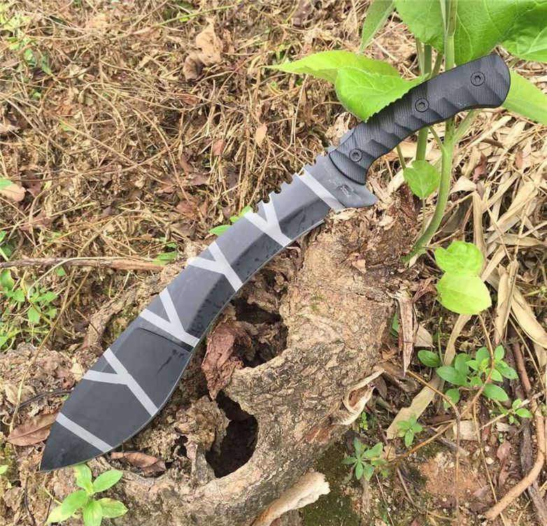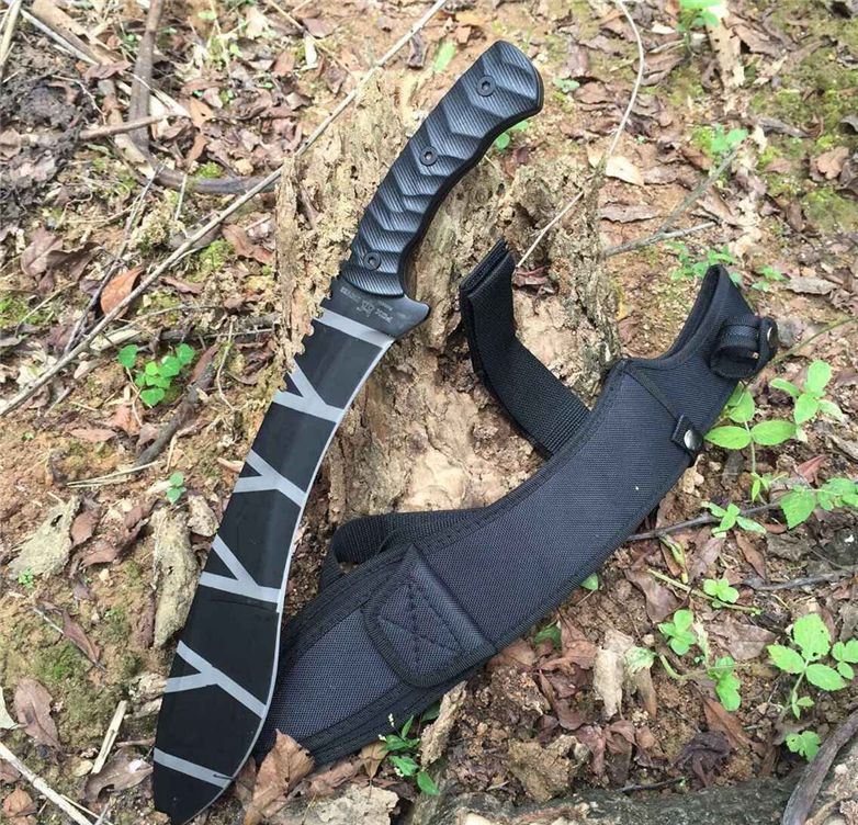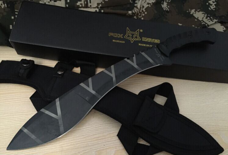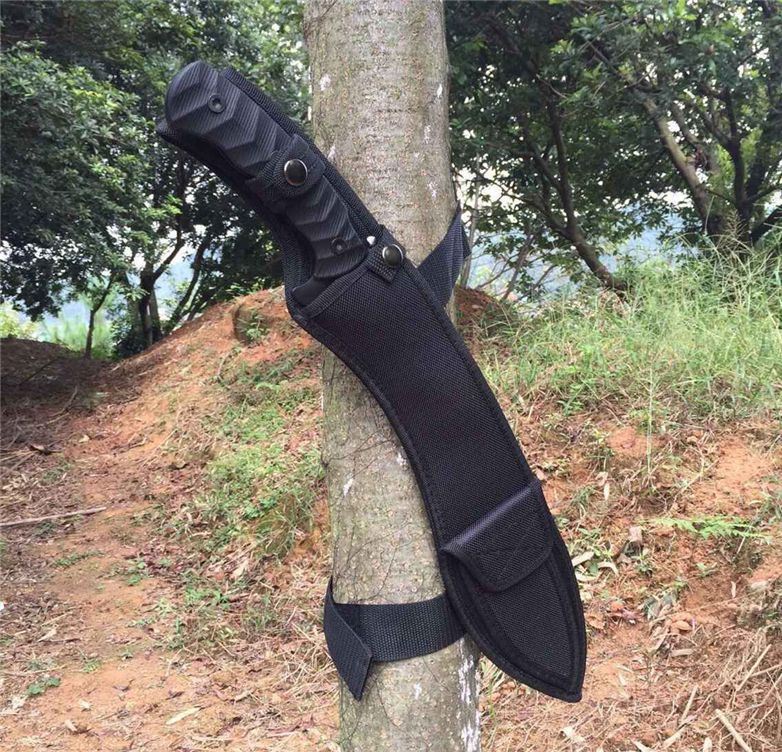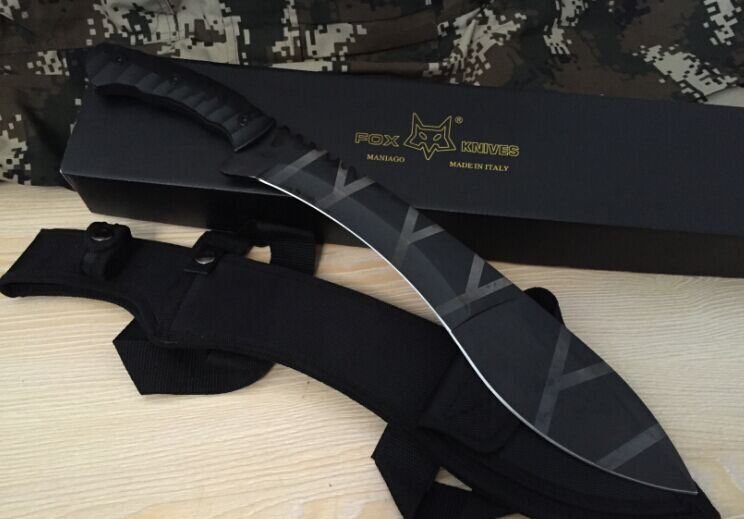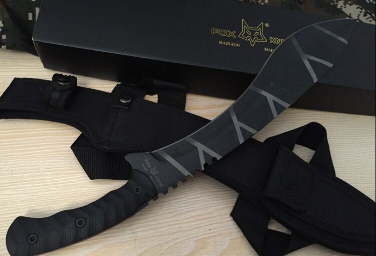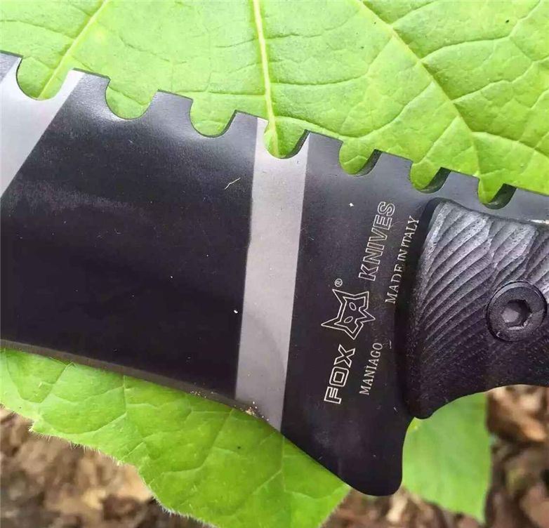 狐狸战术砍刀 全 长:50cm 刃 长:46cm 刃 宽:7cm(最宽处) 刃 厚:6.2mm 柄 长:13cm 表 面: 高温发黑 刃 材: 5Cr15 硬 度: 58HRC 柄 材: G10防滑柄片 结 构:龙骨一体贯穿整体 包 装:尼农套+彩盒