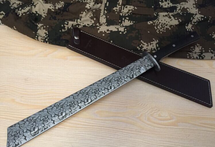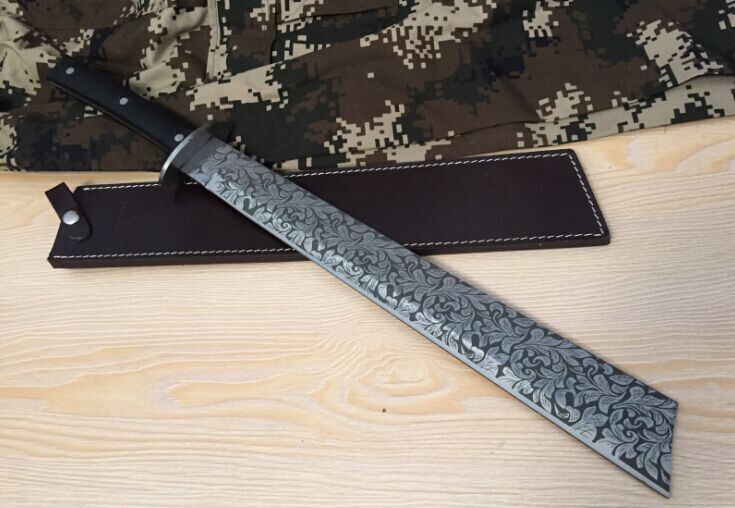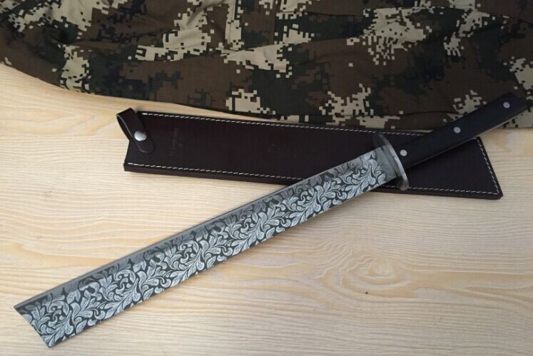 菊男版刀王(方头) 全 长:64.5cm 刃 长:45cm 刃 宽:5.5cm(最宽处) 刃 厚:6.2mm 柄 长:13cm 表 面: 拉丝面 刃 材: 5Cr15 硬 度: 58HRC 柄 材: 黑檀木防滑柄片 结 构:龙骨一体贯穿整体