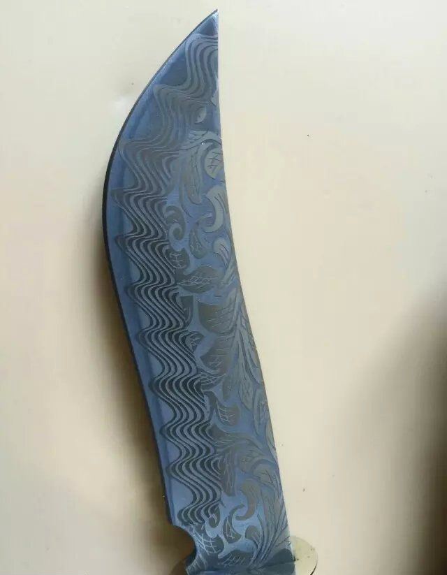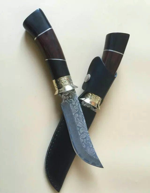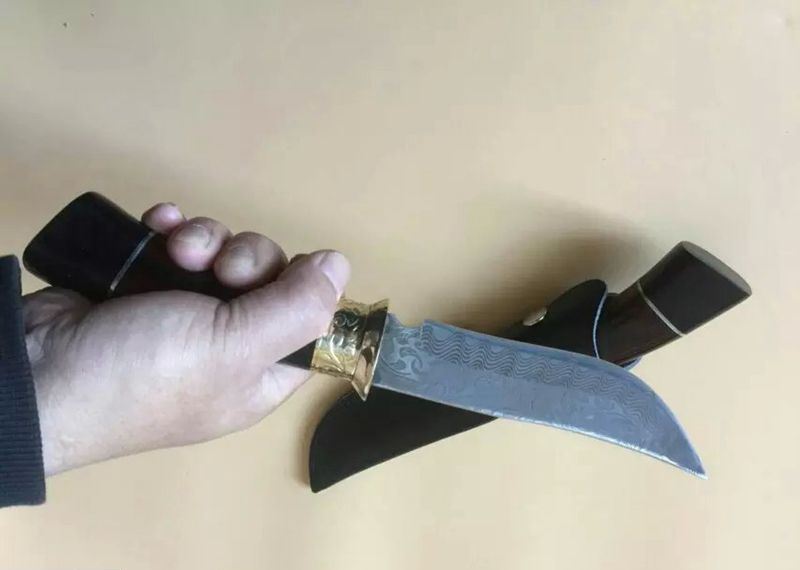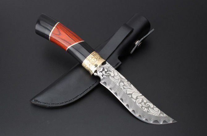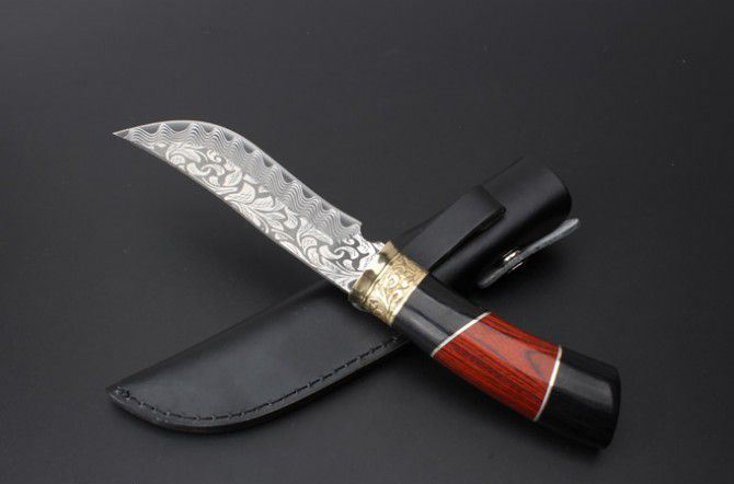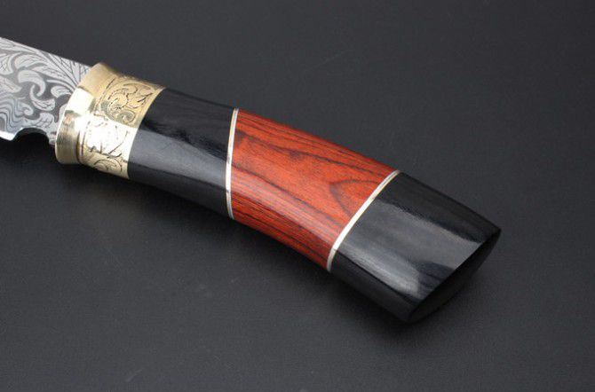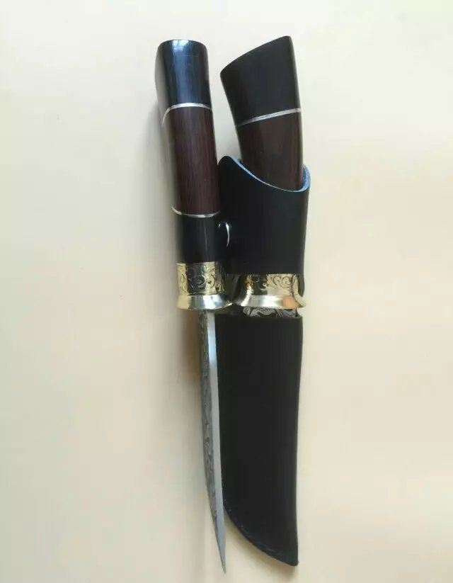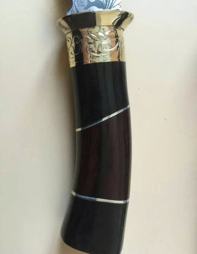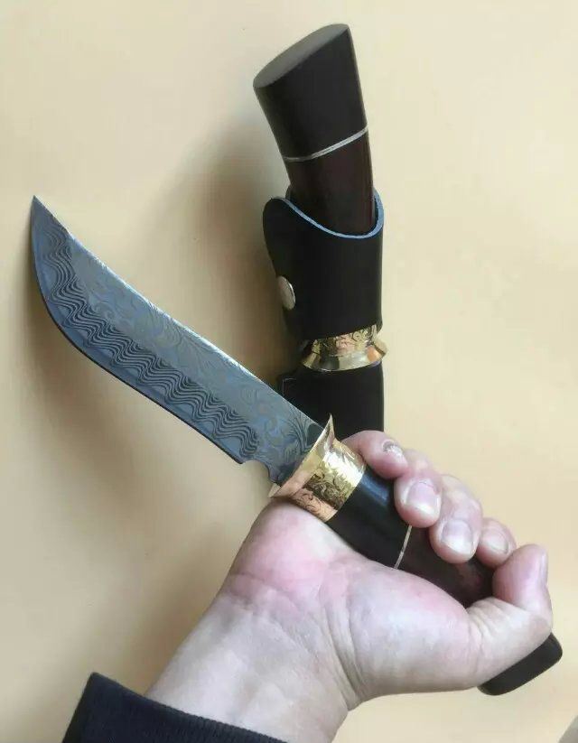 俄罗斯027猎刀 全 长:275mm 刃 长:145mm 柄 长:133mm 刃 宽:32mm 刃 厚:4.1mm 刃 材:5Cr13Mov 重 量:318g(含包装) 硬 度:57HRC 表 面:雕花 柄 材:黄铜+彩木+黑木 锁 型:定锁 其 他:配皮套