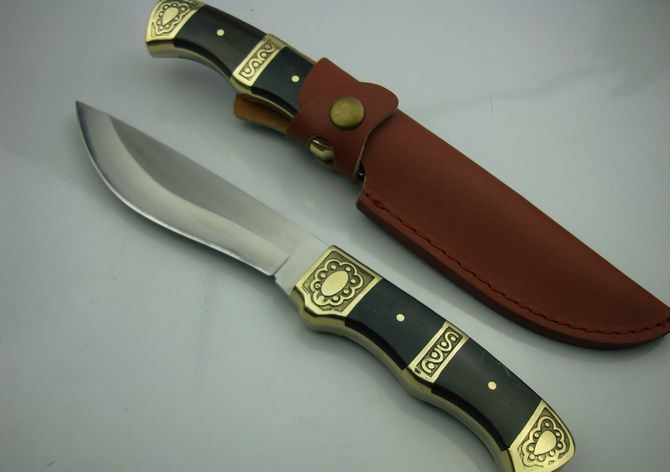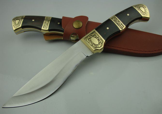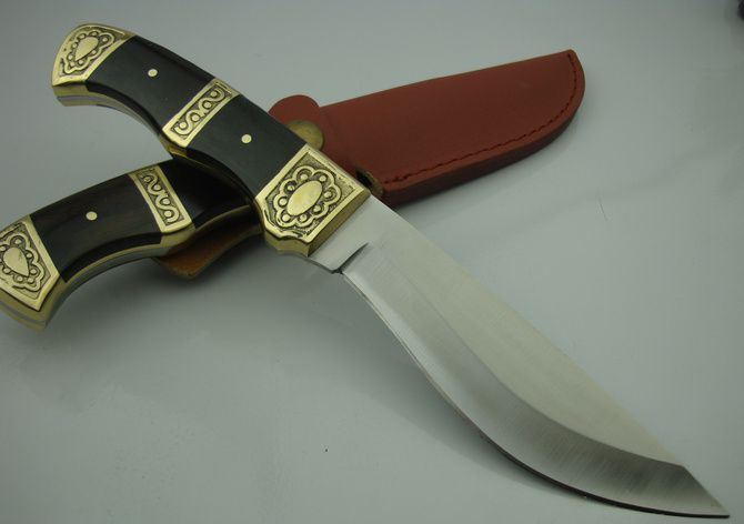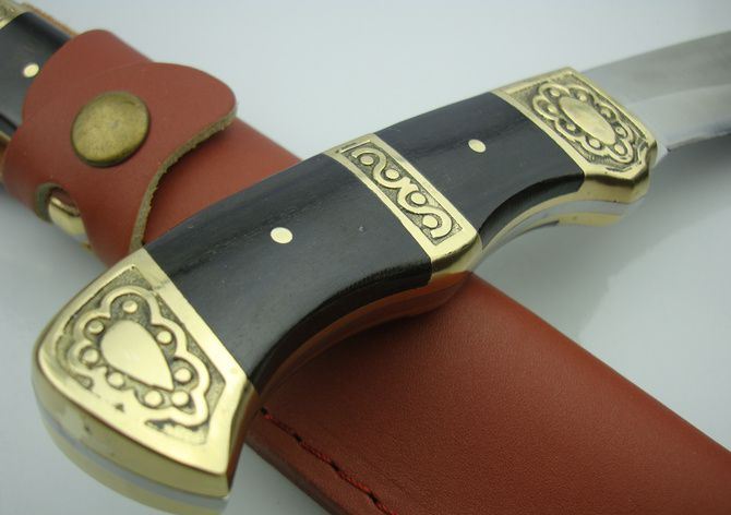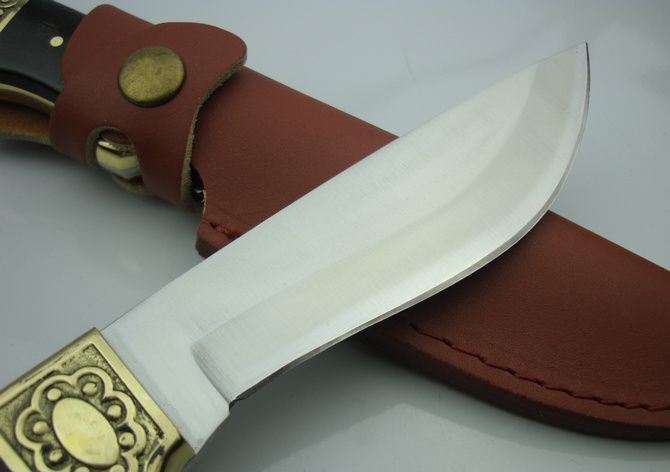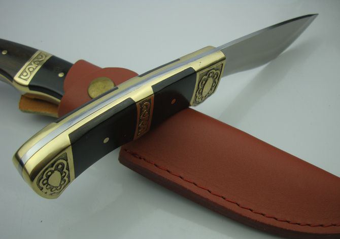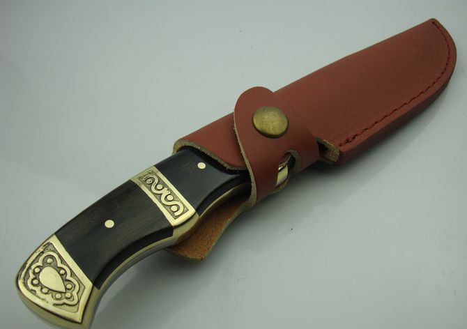 黑风侠一号猎刀 全 长:25.7cm 刃 长:12.8cm 柄 长:12cm 刃 厚:3.0mm 刃 材:440C 硬 度:57HRC 刀 柄:黑木/雕花铜头 表 面:沙光 重 量:290.0克(包括皮套) 备 注:带皮套