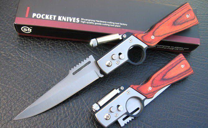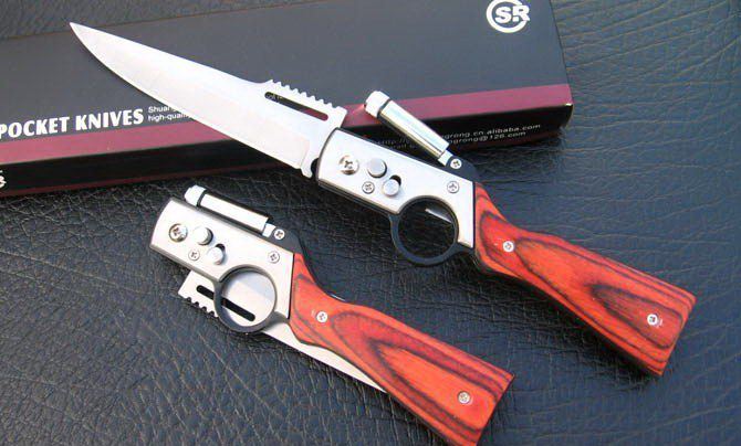 AK枪式带灯弹刀 全 长:25cm 刃 长:11cm 刃 厚:2mm 刃 材:420A 硬 度:56Hrc 表 面:喷砂 柄 材:彩木 净 重:250 刀 套 无锁 定 轴锁 款式不错,做工和质量也都还可以,还有一个LED灯 。价格实惠! LED灯内置小型钮扣电池3-4个。由于天气湿度或是存放时间较长,都有可能造成电池失电而不亮灯的情况。请自行更换电池即可。