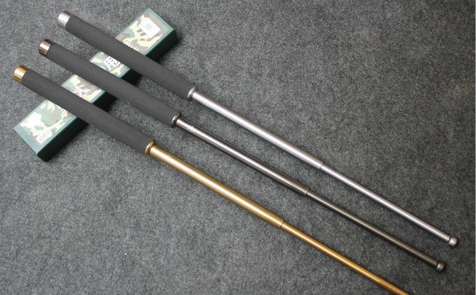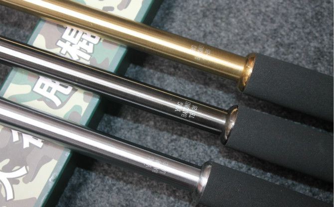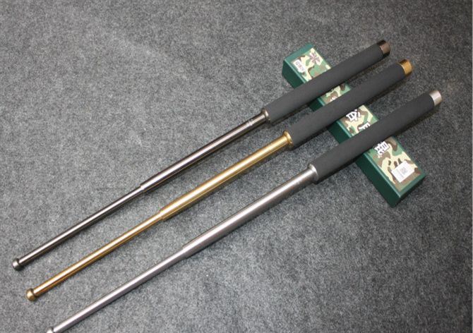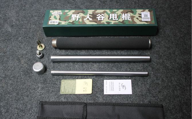 A级野人谷甩棍26寸加强版车压不坏(金色、银色、黑钛) 棍体材料:高强度合金钢, 硬度大概58HRC 棍把材料:黑色乙烯基合成(防滑材质,不会因流汗潮湿而滑手) 收缩长:24.3 CM (便携隐蔽) 甩出长:64.5 CM (常用长度) 净重:548克 毛重:644克 表面: 黑钛 包装:纸盒+尼龙套 其他性能:钢卡式,专门在接口处精密处理,处理后甩出锁定牢靠, 收回时,朝地面垂直一磕就回去了。
