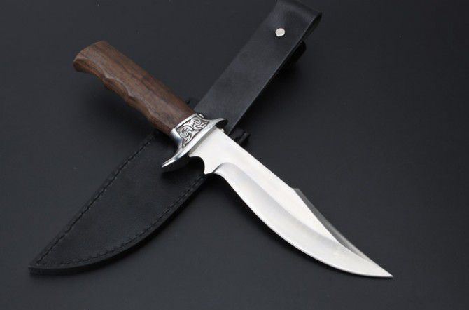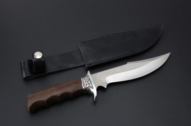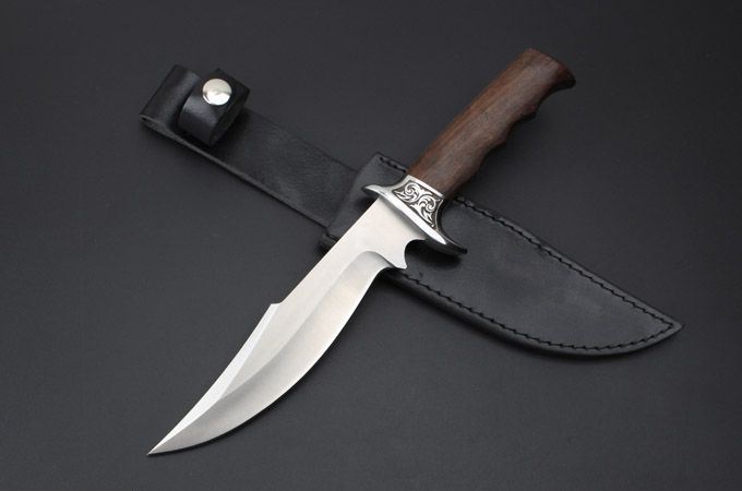 全 长:293mm 刃 长:175mm 柄 长:120mm 刃 宽:36mm 刃 厚:4.8mm 刃 材:优质8铬钢 重 量:379g(含包装) 硬 度:57-58HRC 以上 表 面:砂光 柄 材:钢头护手黑檀木 锁 型:定锁 其 他:配牛皮套