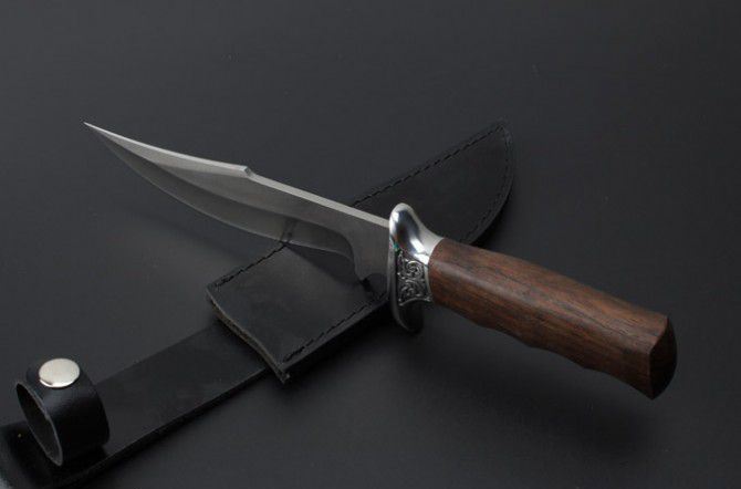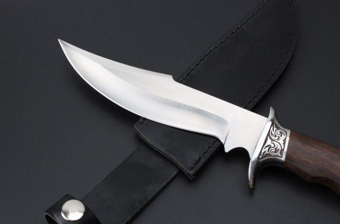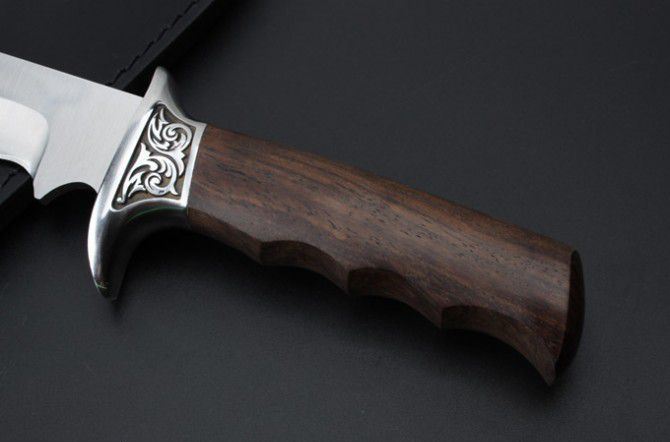 执法者护手格斗刀 全 长:293mm 刃 长:175mm 柄 长:120mm 刃 宽:36mm 刃 厚:4.8mm 刃 材:优质8铬钢 重 量:379g(含包装) 硬 度:57-58HRC 以上 表 面:砂光 柄 材:钢头护手黑檀木 锁 型:定锁 其 他:配牛皮套