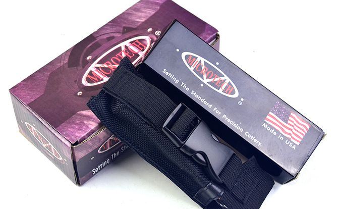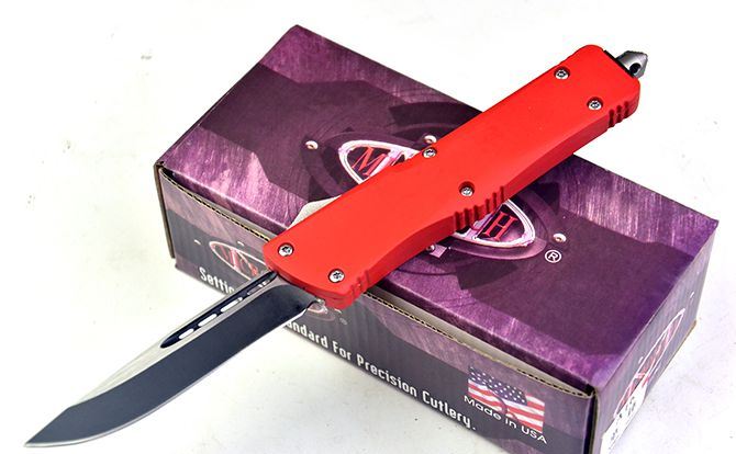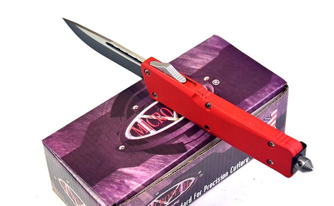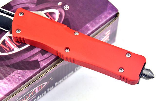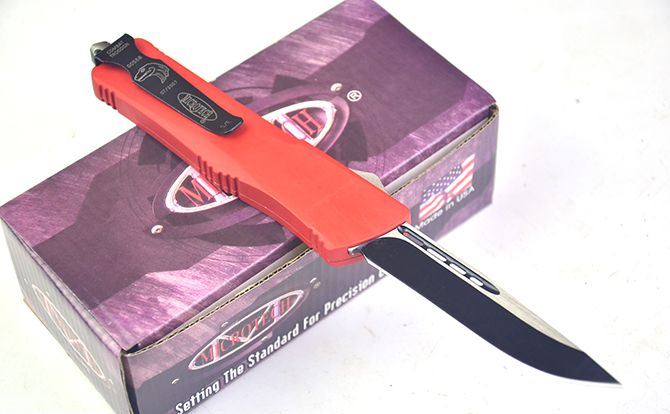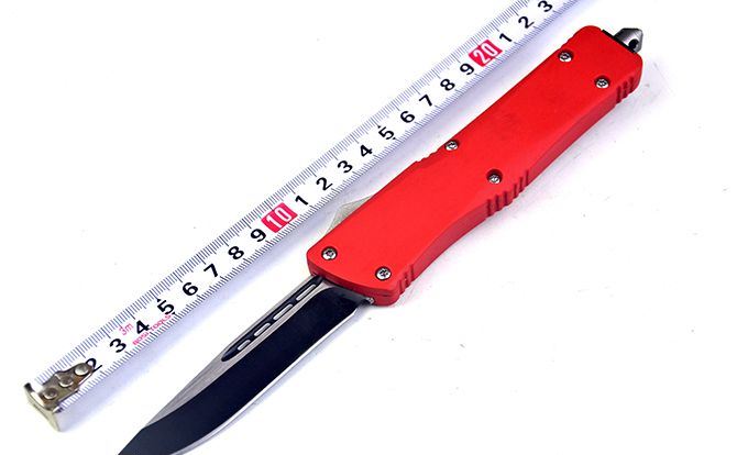 微技术.小号伤齿龙(红色) 全 长: 24.2cm (含尾锥长度) 刃 长: 10cm 刃 厚: 3mm 刃 材: 440 硬 度: 58HRC 刀净重:160克 总重量: 280克(含包装物) 表 面: 黑钛 柄 材: 锌铝合金 刀 鞘: 尼龙 锁 闭: 弹簧直出