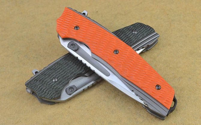 全 长:21.5cm 刃 长:9.3cm 柄 长:12cm 刃 宽:3cm 刃 厚:3.6mm 刃 材:5Cr13Mov 重 量:248(含包装) 硬 度:56HRC 表 面:石洗/拉丝 柄 材:绿G10/橙G10 柄片(两款任选) 锁 型:一体线锁 包 装:高档纸盒 色 彩:砂光黑柄、砂光橙柄、石洗黑柄、石洗橙柄 备 注:带腰夹