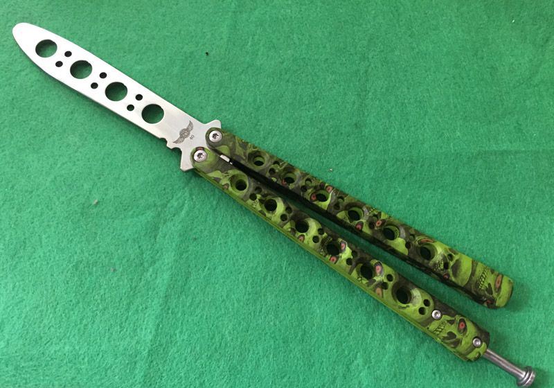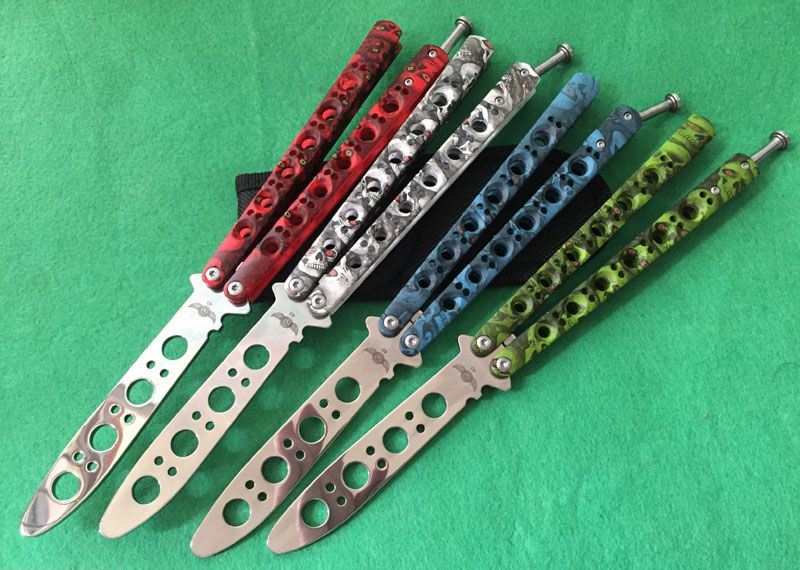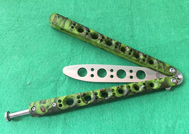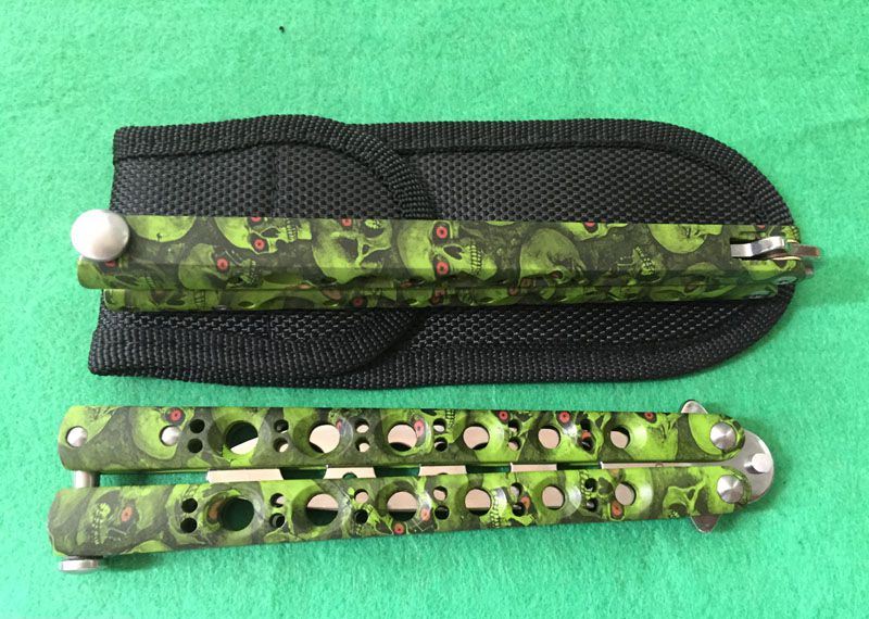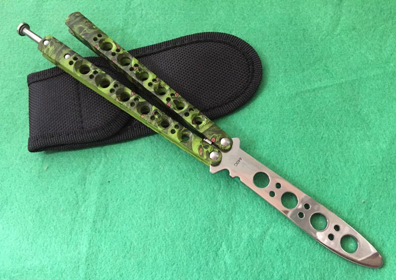 The One BM40魔系列甩刀 (四色) 全长:23.8CM 刃长:9.5CM 刃厚:0.3CM 刃材料:440C 刃硬度:58 柄材料:不锈钢一体压铸,表面迷彩处理 柄硬度:40 重量:170克 刀鞘:高级尼龙套,可横竖挂皮带 The One BM47魔(迷彩)系列,由The One 精工打造!一体柄型,迷彩魔头图案,搭配镜面锋刃,炫酷“魔“色