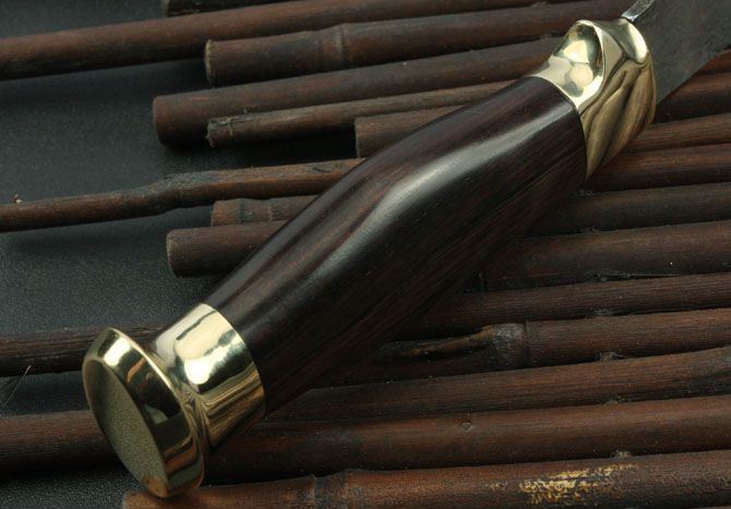 大马士革龙腾刀 全 长: 23.7cm 刃 长: 10cm 柄 长: 11.8cm 刃 宽: 3cm(最宽处) 硬 度: 58HRC 刃 厚: 0.28cm 柄 材: 双铜头+黑檀木 重 量: 252克(含包装) 刃 材: 进口大马士革钢 表 面: 大马士革钢特有的花纹原色 大马士革钢花纹和把手木纹及颜色各异,以实物为准!