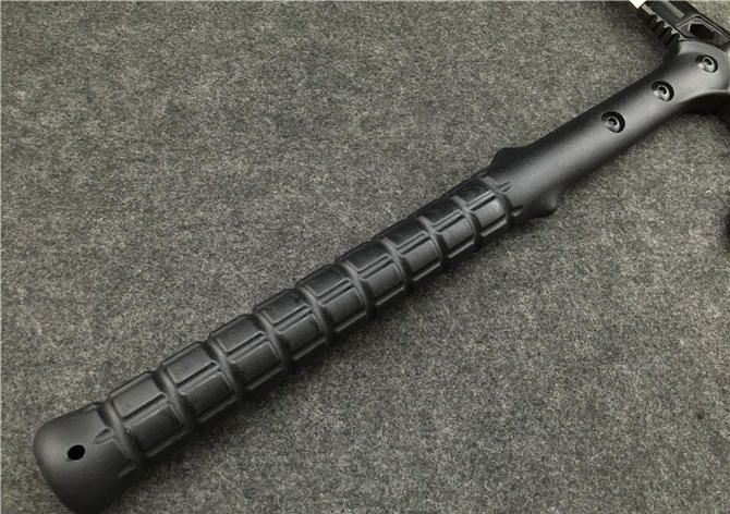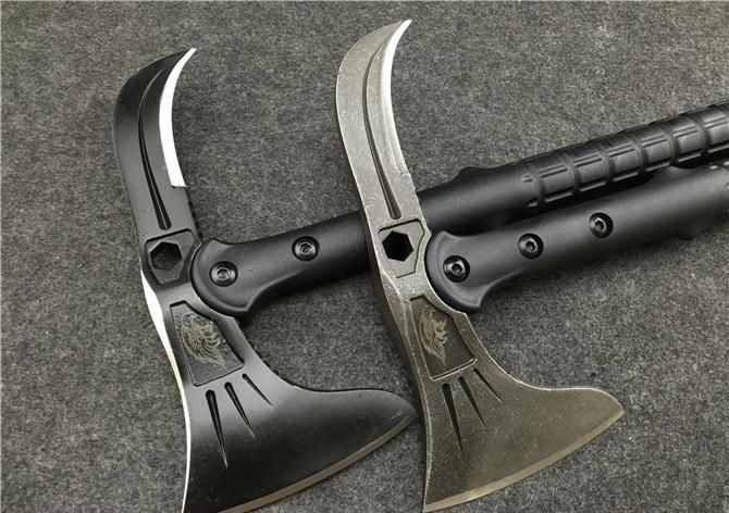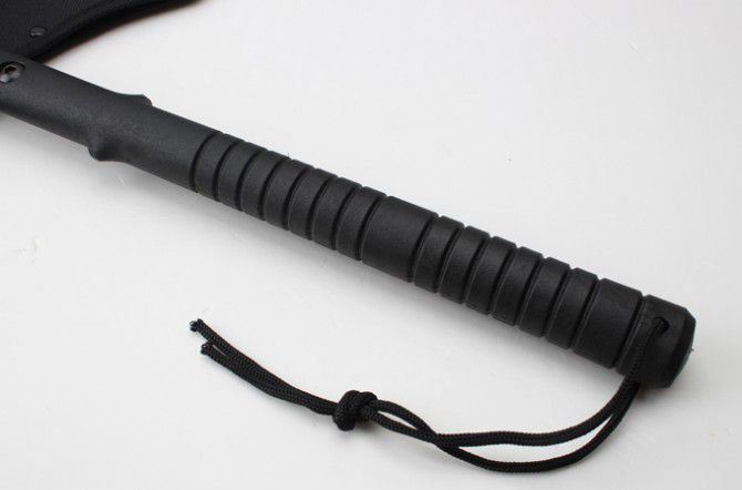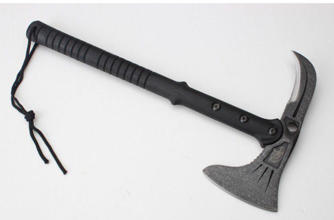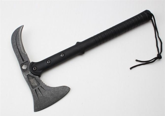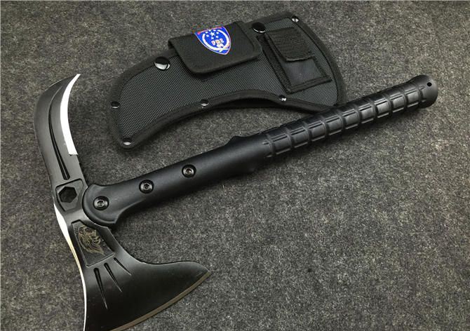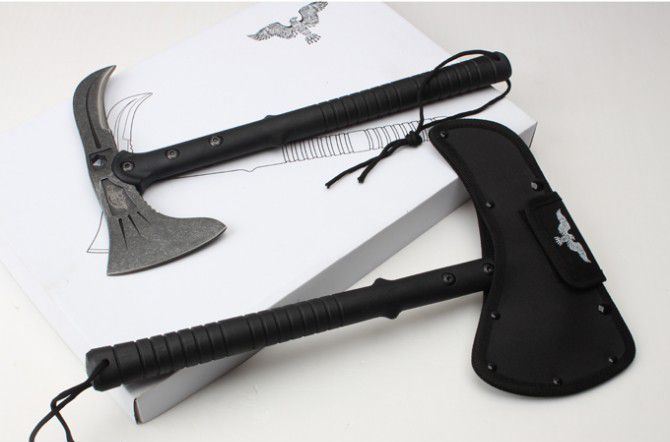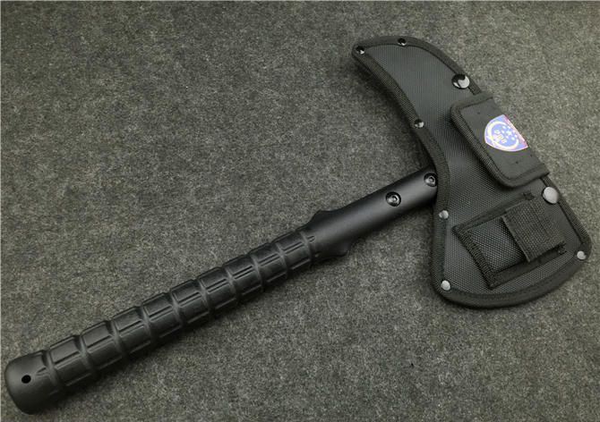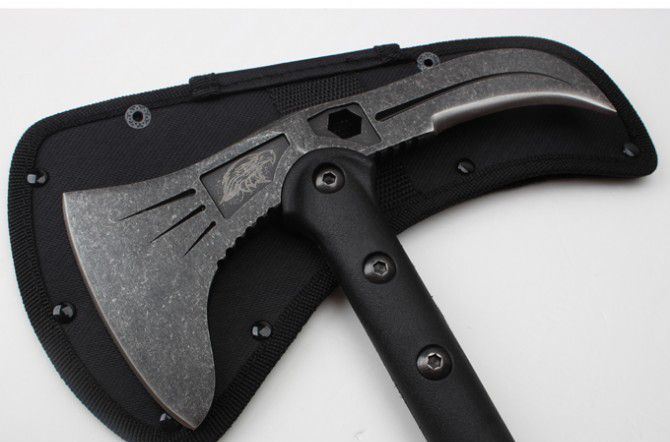 雄鹰战术斧(黑版、石洗版) 全长:39CM 刃长:11.5CM和7.5CM 柄长:37CM 刃厚:1.5CM 刃宽:21.5CM 刃材:精铸钢,全刃开锋 柄材:尼龙+玻璃纤维 硬度:56-57 毛重:980克(含尼龙袋、盒子) 表面:黑色 刀套:加厚尼龙(可绑在腰间)