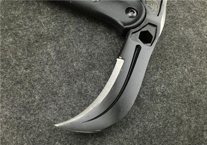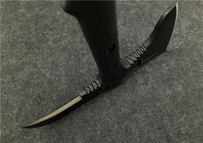全长:39CM 刃长:11.5CM和7.5CM 柄长:37CM 刃厚:1.5CM 刃宽:21.5CM 刃材:精铸钢,全刃开锋 柄材:尼龙+玻璃纤维 硬度:56-57 毛重:980克(含尼龙袋、盒子) 表面:黑色 刀套:加厚尼龙(可绑在腰间)