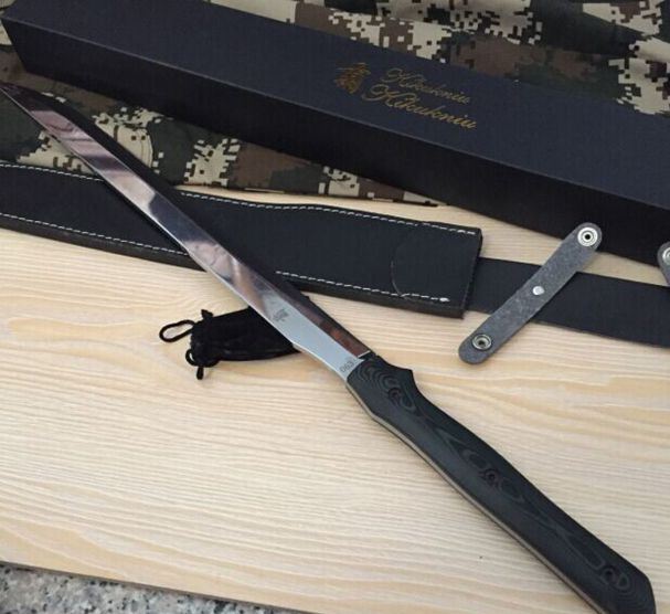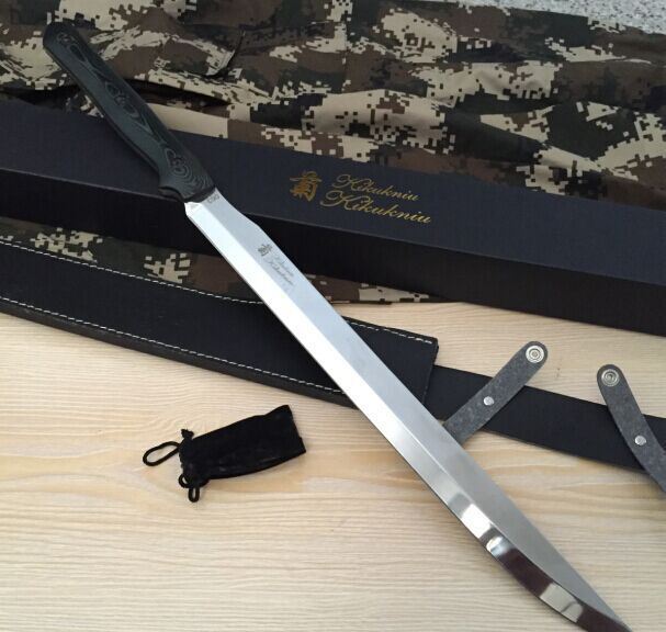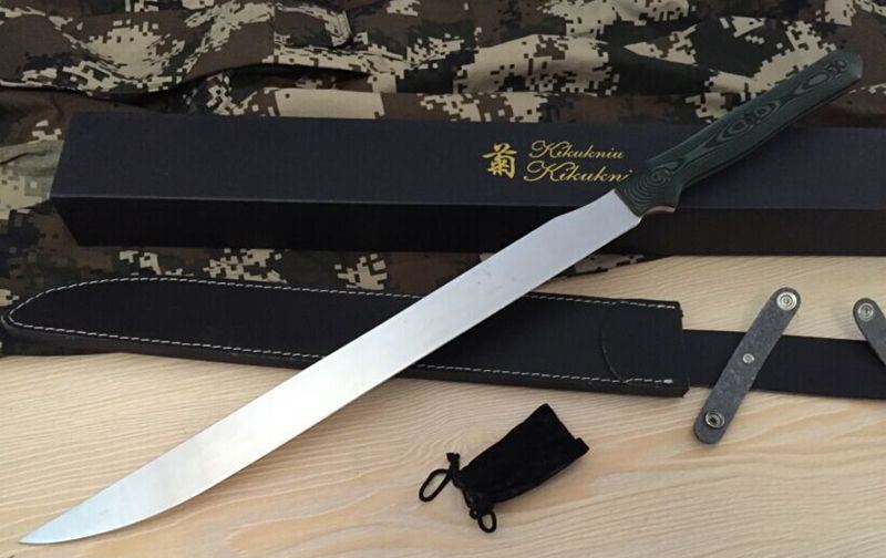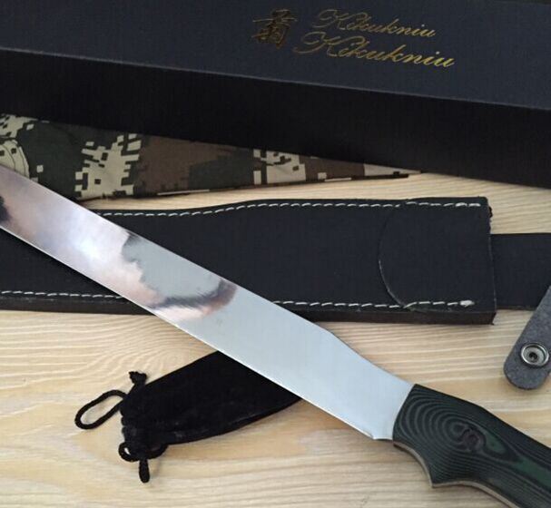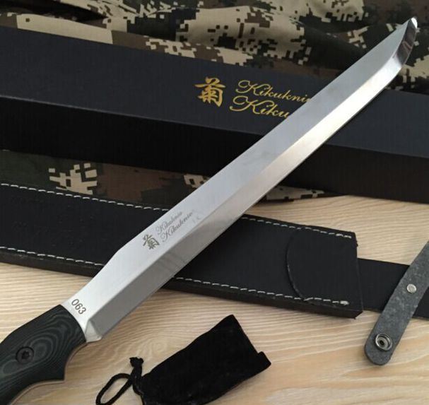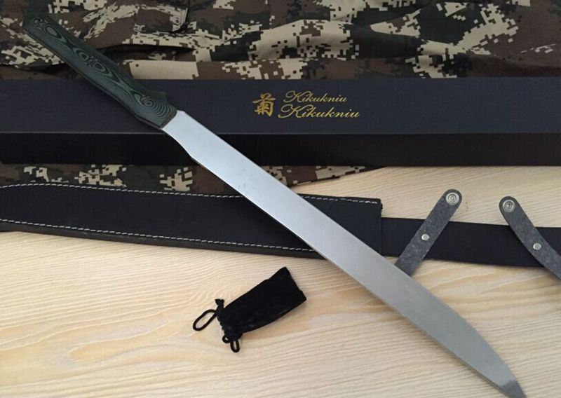 新版菊男长刀镜光版 全 长:680mm 刃 长:450mm 柄 长:223mm 刃 宽:37mm 刃 厚:5.5mm 刃 材:5Cr13Wov 重 量:1320g(含包装) 硬 度:59HRC 表 面:镜光 柄 材:米克塔 锁 型:定锁 其 他:配皮套
