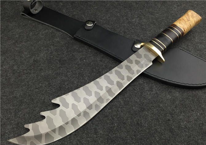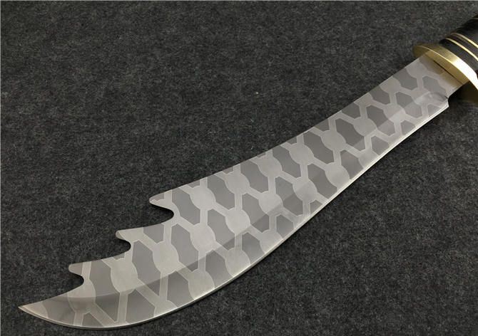 勃朗宁武林至尊(枪钛网纹) 全长:45cm 刃长:28.5cm 柄长:14.7cm 刃厚:5mm 刃宽: 5cm 刃材: 7Cr17(加手工锻打) 柄材: 扎皮柄(白铜托+7片白铜片+22片截源进口G10+白影木) 硬度: 58-59HRC 重量:850克(含包装物) 表面处理: 枪钛