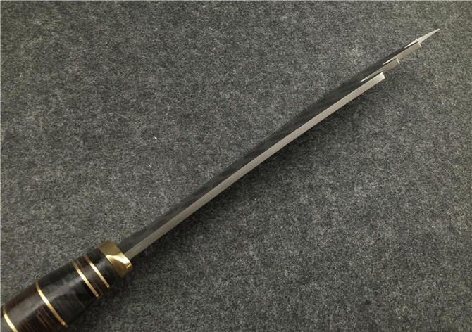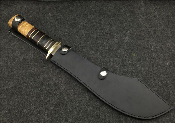 全长:45cm 刃长:28.5cm 柄长:14.7cm 刃厚:5mm 刃宽: 5cm 刃材: 7Cr17(加手工锻打) 柄材: 扎皮柄(白铜托+7片白铜片+22片截源进口G10+白影木) 硬度: 58-59HRC 重量:850克(含包装物) 表面处理: 枪钛