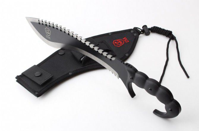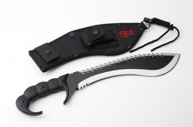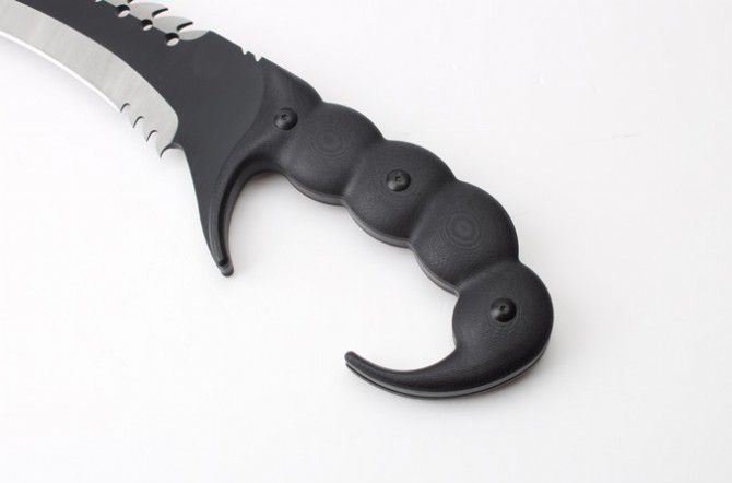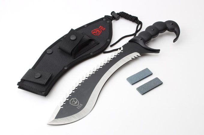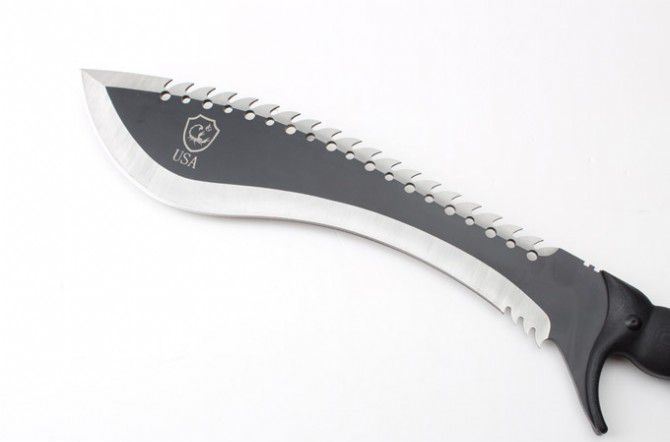 实用版毁灭者之蝎子王狗腿刀 全 长:447mm 刃 长:300mm 柄 长:150mm 刃 宽:73mm 刃 厚:49mm 刃 材:8cr18mov 硬 度:59HRC 表 面:黑钛 柄 材:钢一体柄+G10柄 净 重:890克 毛 重:1081克(含包装) 其 他:配尼龙套和磨刀石2个USA代工版