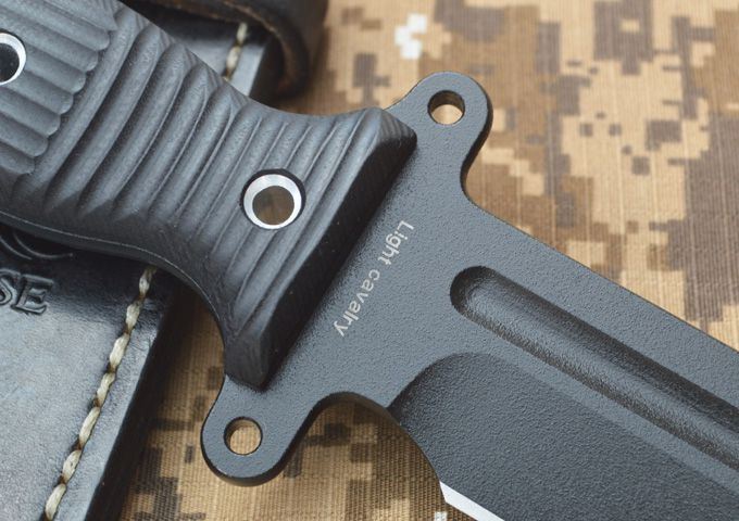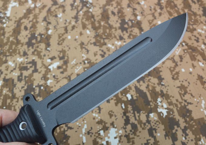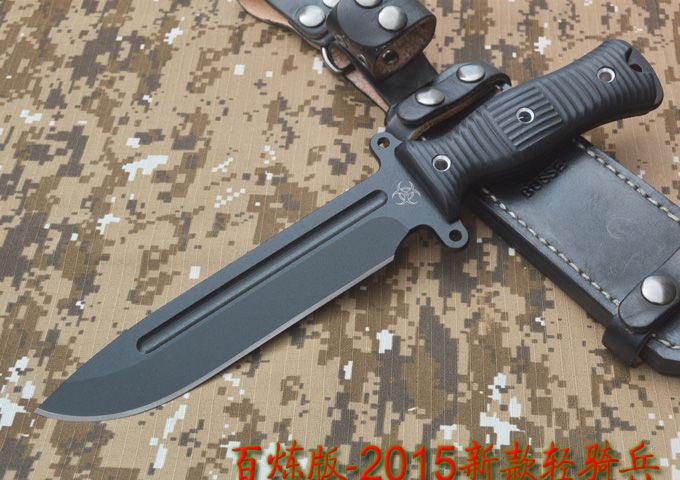 百炼版2015新款轻骑兵 全长:337MM 刃长:197MM 刃宽:42MM 刃厚:6.3MM 刃面打磨:数控V磨 刃面处理:特氟龙涂层 热 处 理:真空油淬热处理 硬度: 58HRC 材料:1095钢材 柄材:黑色G10 刀鞘:纯手工缝制真皮套(黑色皮套) 包装:黑色礼品盒 刀重:约600G 刀鞘重:约250G 总重:约1150G(包括黑色礼品盒等)