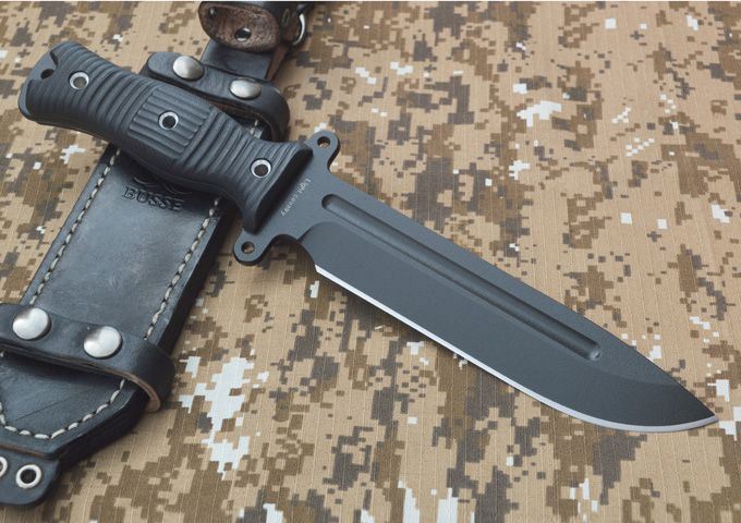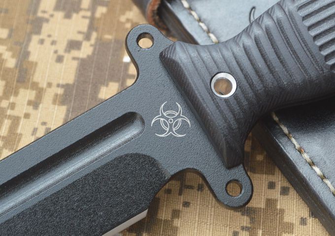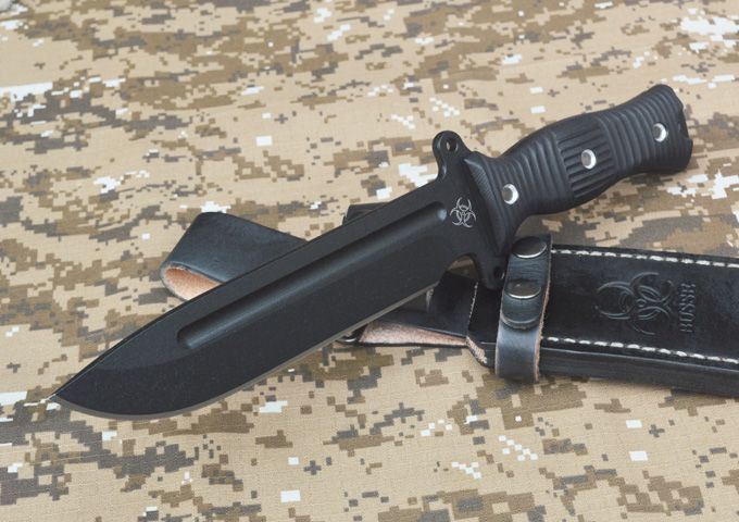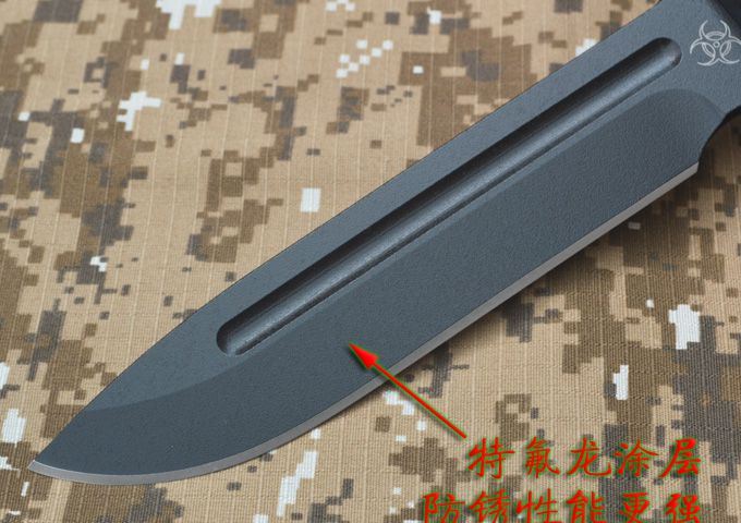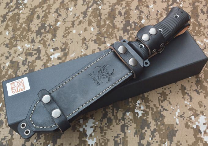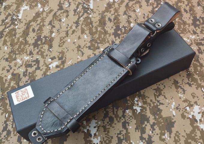全长:337MM 刃长:197MM 刃宽:42MM 刃厚:6.3MM 刃面打磨:数控V磨 刃面处理:特氟龙涂层 热 处 理:真空油淬热处理 硬度: 58HRC 材料:1095钢材 柄材:黑色G10 刀鞘:纯手工缝制真皮套(黑色皮套) 包装:黑色礼品盒 刀重:约600G 刀鞘重:约250G 总重:约1150G(包括黑色礼品盒等)