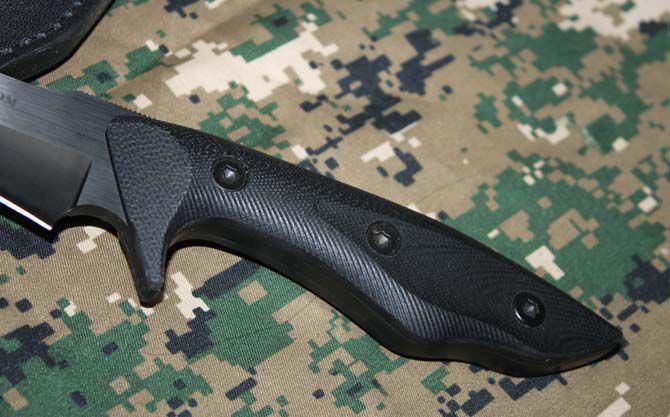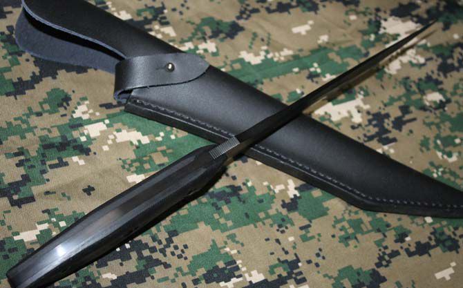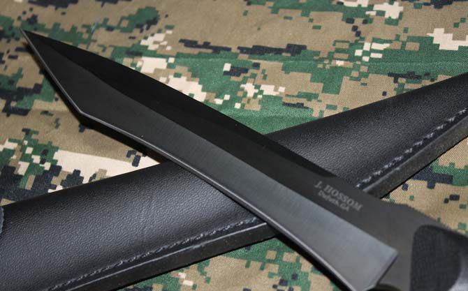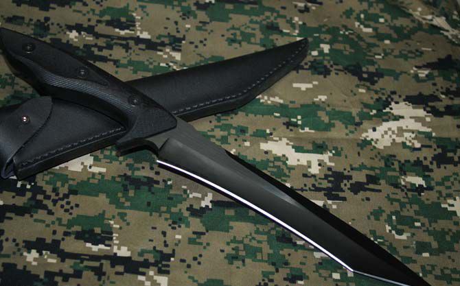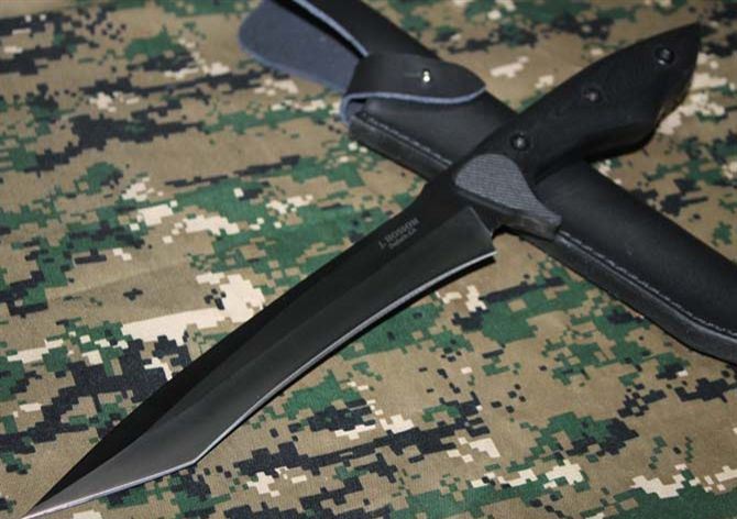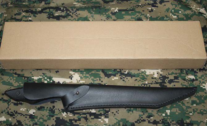 精仿J.HOSSOM黑钛版手工刀 全 长:365mm 刃 长:215mm 柄 长:40mm 刃 宽:27mm 刃 厚:5.6mm 刃 材:7Cr17Mov 重 量:505g(含包装) 硬 度:58HRC 表 面:黑钛 柄 材:黑色G10 锁 型:定锁 其 他:配牛皮套