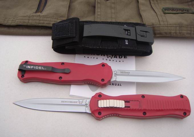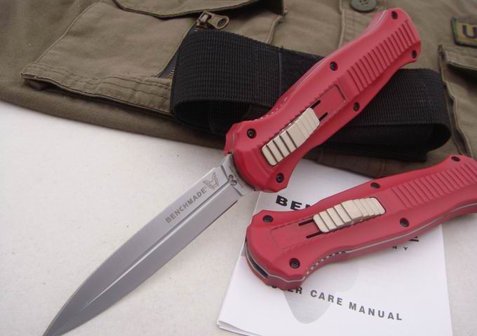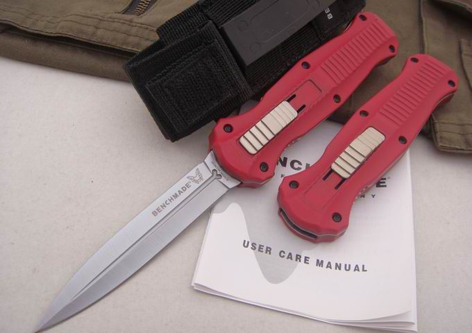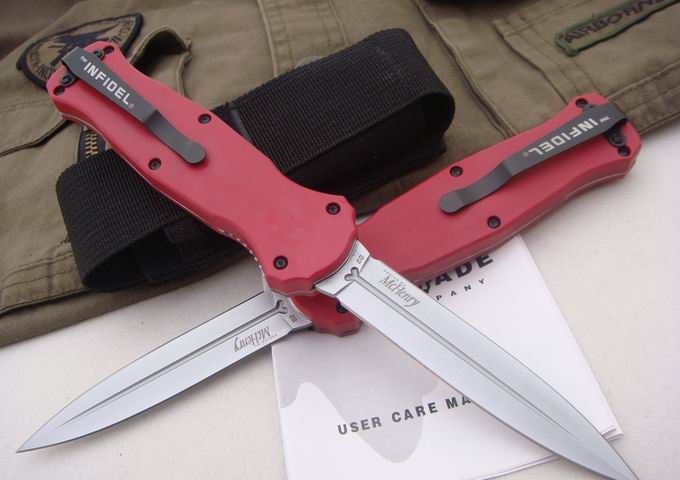 精仿蝴蝶双锋直弹刀(红色) 全 长:22.6cm 刃 长:10cm 刃 厚:2.5mm 刃 材:440 硬 度:58Hrc 表 面:钛离子 柄 材:合金铝+内衬钢片 净 重:149g 刀 套:科杜拉 锁 定:自动锁