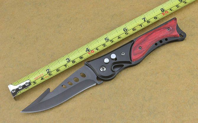 红鹦鹉B-128弹簧刀 全长:20.5CM 刃长:8.8CM 刃厚:0.25CM 刃宽:2.8CM (最宽处) 刃材:420 硬度:54HRC 柄长:11.5CM 重量:120克(含彩盒子) 涂层:氧化黑 柄材:合金铝+彩木 锁定:按键锁+安全锁 其他:带腰夹