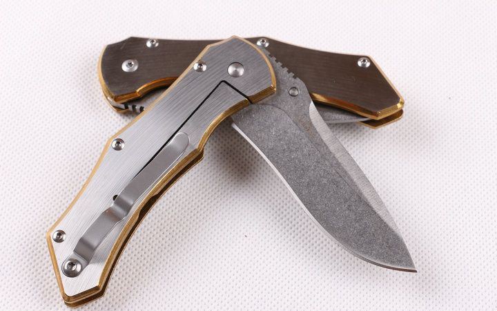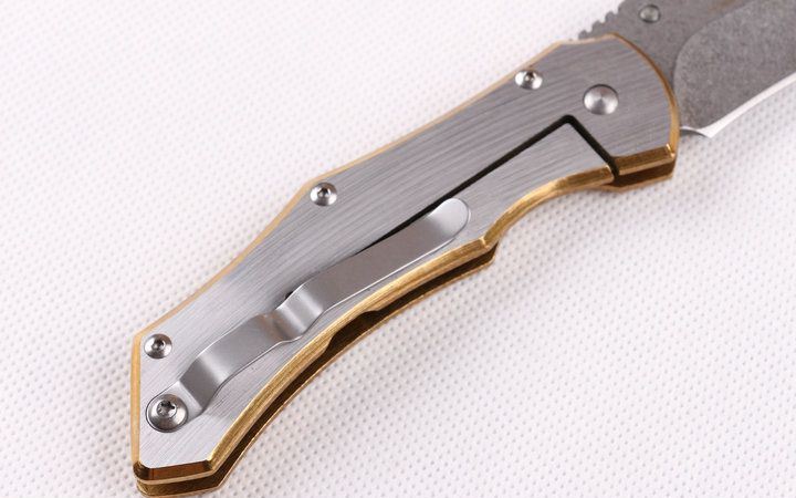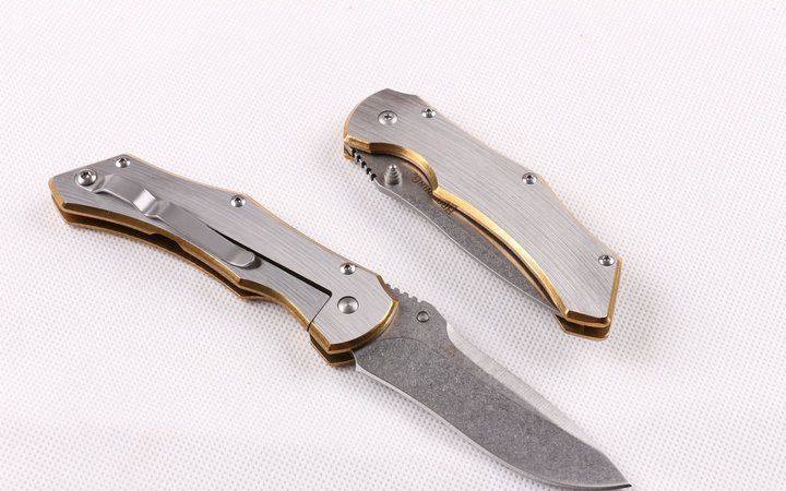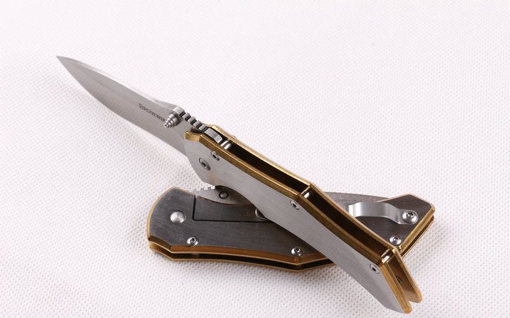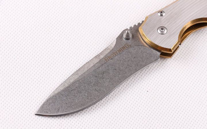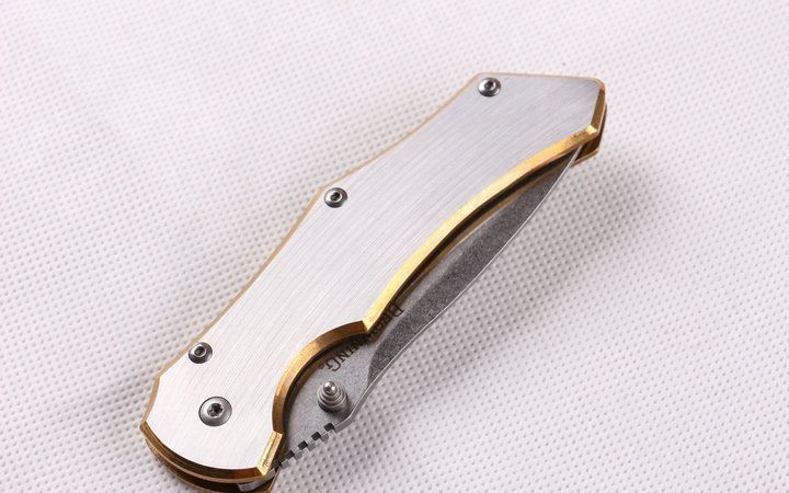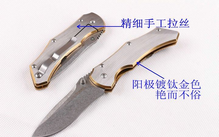 勃朗宁钛金色精工折刀 全 长:18.1cm 刃 长:7.8cm 刃 宽:2.3cm(最宽处) 刃 厚:3.0mm 柄 长:10.5cm 表 面: 灰钛 刃 材: 440C 硬 度: 57HRC 柄 材: 全钢镀钛金色,然后精工拉丝,极高美观漂亮。 重 量:150克(含彩盒子) 锁 闭:线锁 备 注:带腰夹